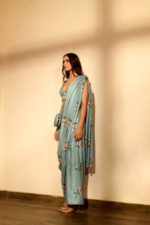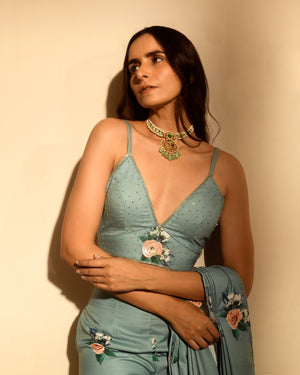 Dusty Teal Sequins Pant Saree Set