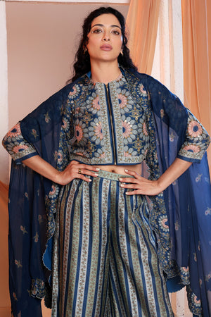 Blue Eraya printed Crop Top with Flared Pants in linen silk, Paired with an Embroidered Cape in organza.