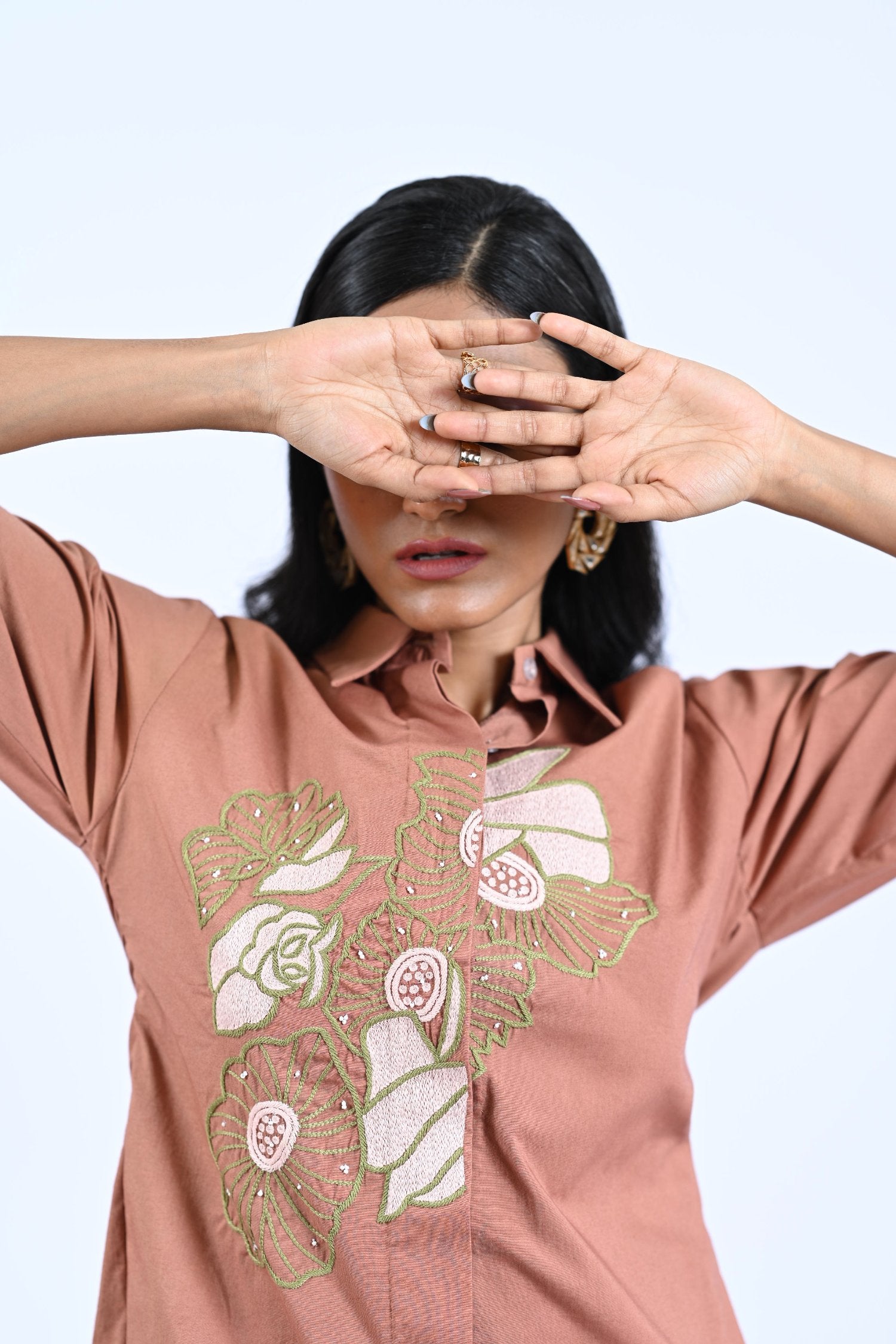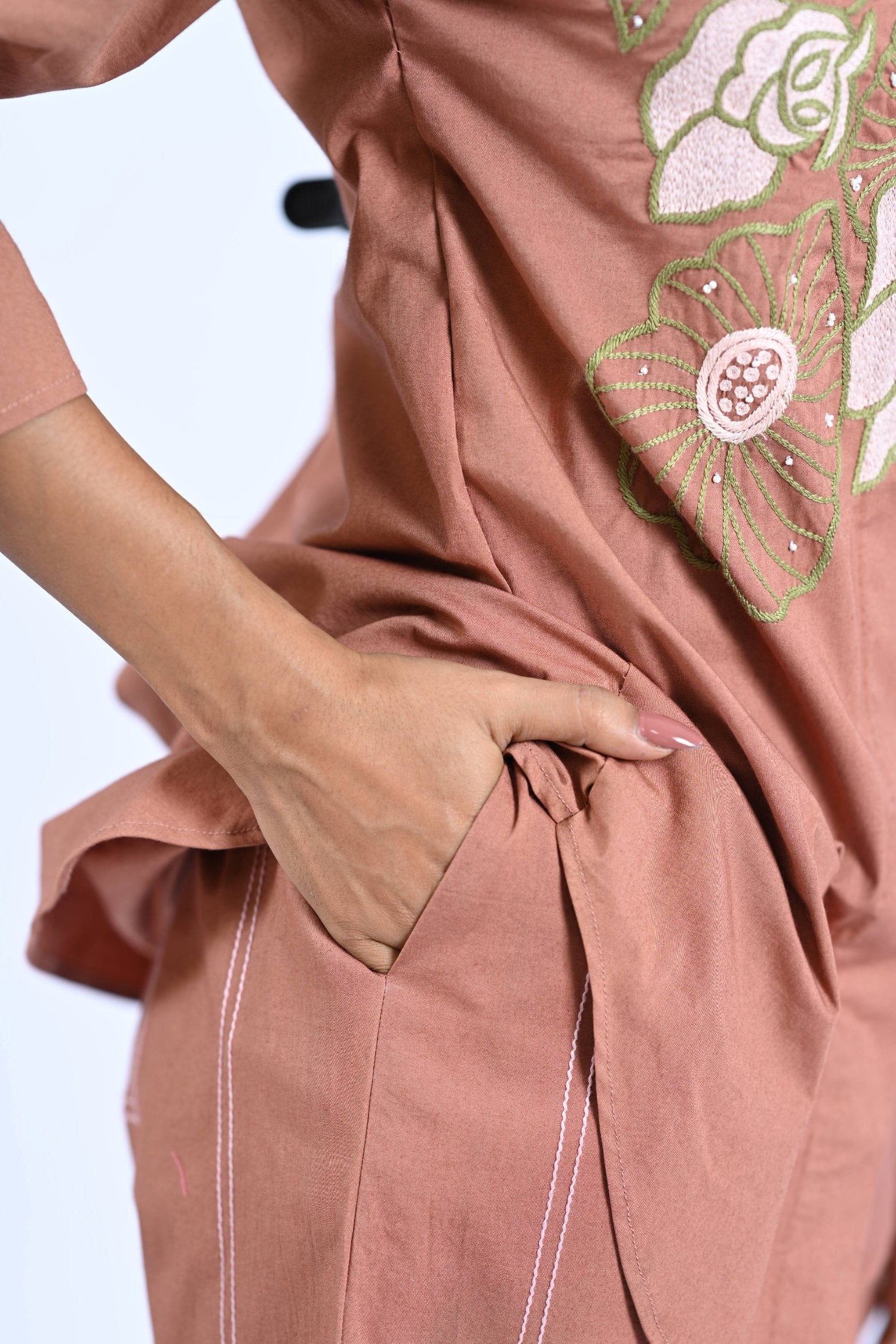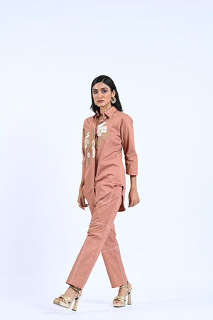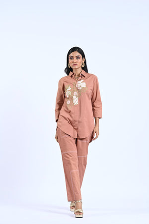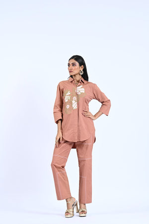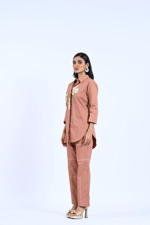 This Ebony Co-ord features a stylish flower thread embroidery shirt with stitch detailing trousers. Crafted with precision, this outfit exudes elegance and sophistication. Elevate your fashion game with this exquisite co-ord, perfect for any special occasion.