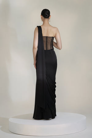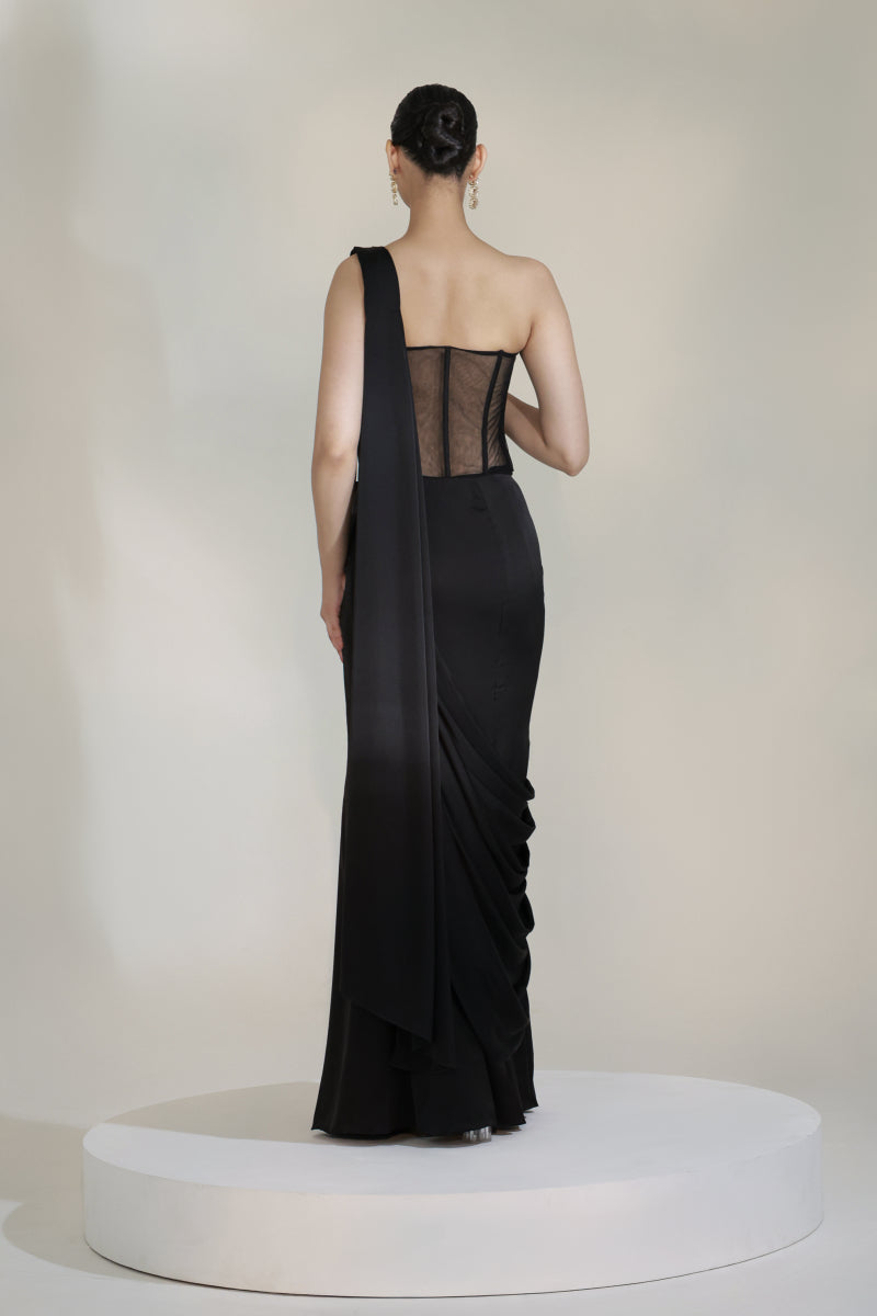 Command the spotlight in our BLACK Corset Saree — a sculpted silhouette that marries structure with fluidity. Designed in luxurious fabric with hand embroidery, the corset contours the body with precision, while the pre-draped saree cascades effortlessly for a modern, yet timeless appeal. With refined gathers and a cinched waistline, this ensemble is your go-to for elevated celebrations and unforgettable entrances.