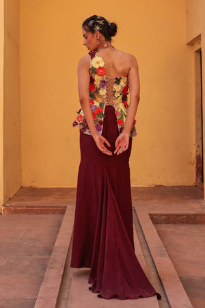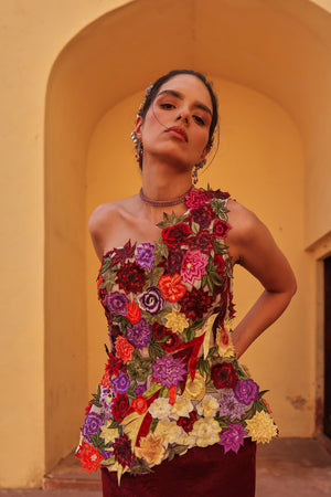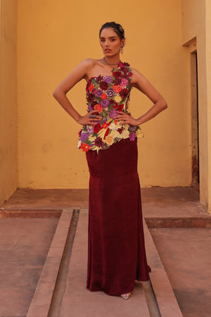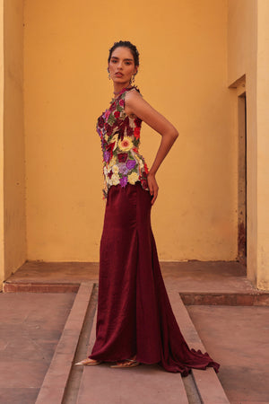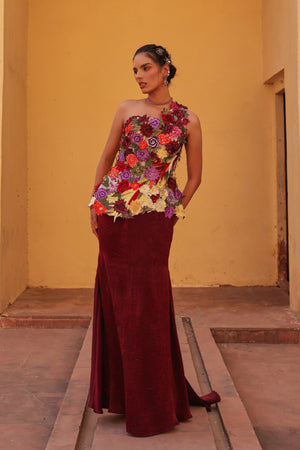 This striking two-piece set features a single- shoulder statement bodice adorned with intricate floral appliques in a vibrant medley of hues. Paired with a gracefully draped skirt crafted in rich sandwash satin.