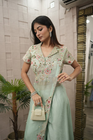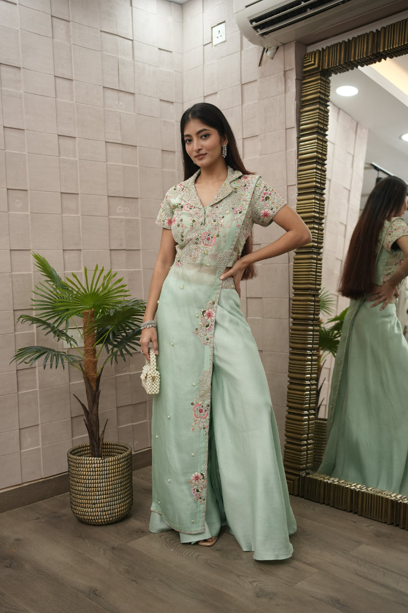 Step into effortless elegance with our Powder blue Eira set , a signature Ojasvini ensemble featuring our iconic drape sharara set featuring a hand-embroidered blouse with a wrap-style drape and collared neckline. Paired with sharara and intricate floral detailing, this look blends structure with softness — perfect for intimate occasions that call for subtle glam.