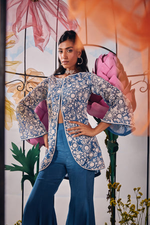 Electric blue dori embroidery jacket with kalidaar sharara and inner