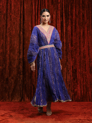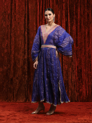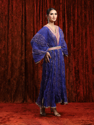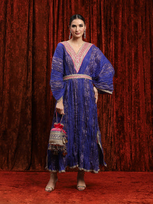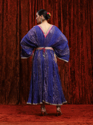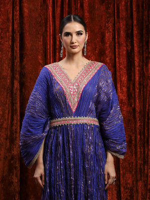 Featuring a Electric Blue & Rani Pink Crinkle kaftan in Lurex Cotton and with fine gota, dori, badla work.
