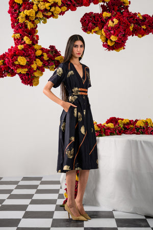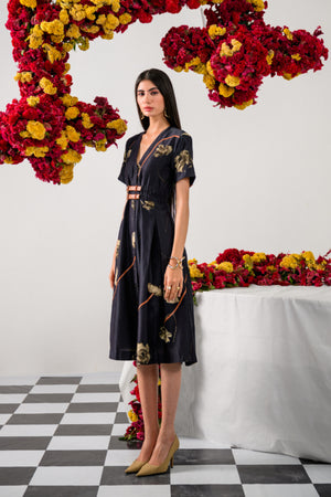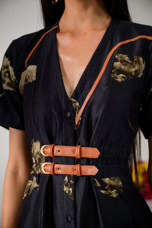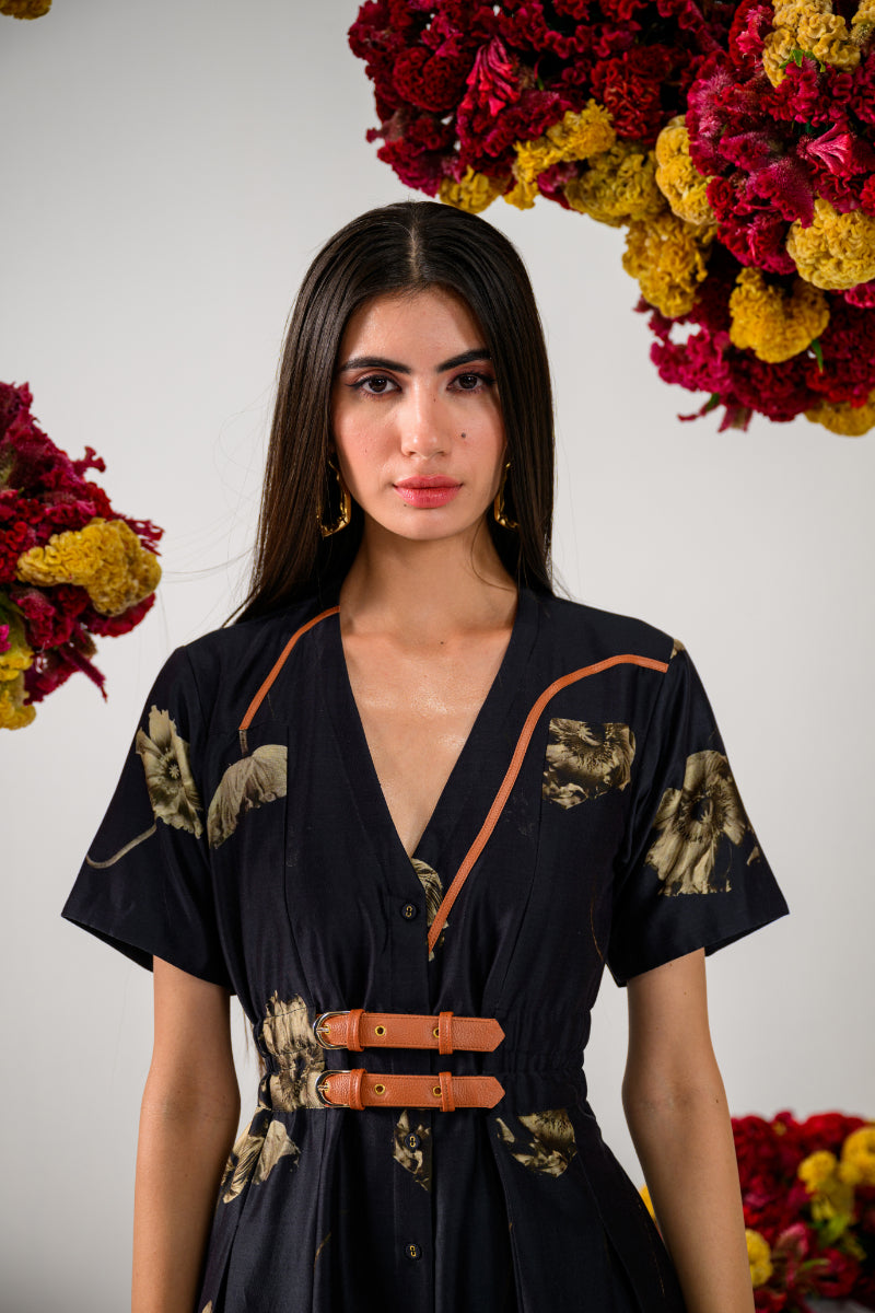 Rule the night in the Queen of Midnight Flare Dress, a captivating blend of elegance and edge. Crafted on a black Chanderi base, this dress showcases underwater floating florals with stems highlighted by sleek brown leather strips. The feminine V-neckline flows into a striking flared silhouette, enhanced by box pleats and cinched perfectly with a bold double leather belt that’s fully adjustable for a flawless fit. The front placket with matching black fabric buttons and chic half sleeves bring this regal look to a stylish close.