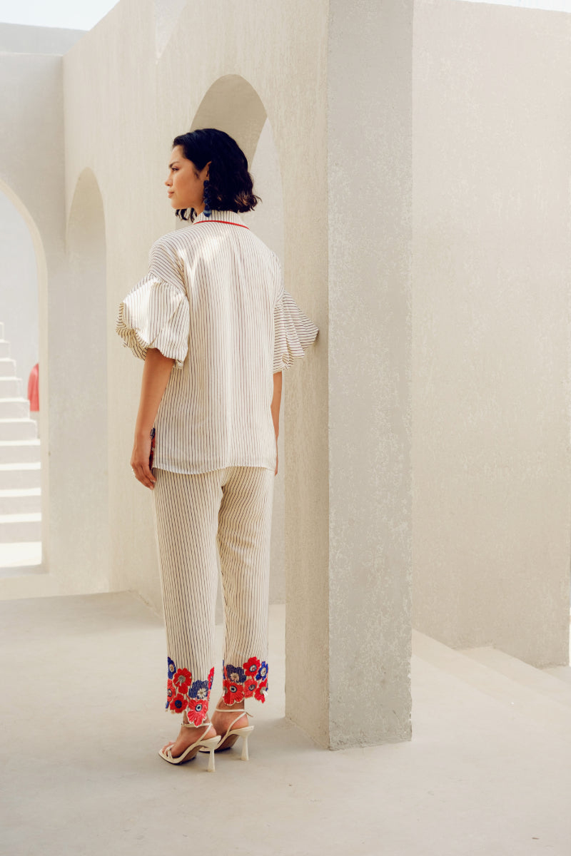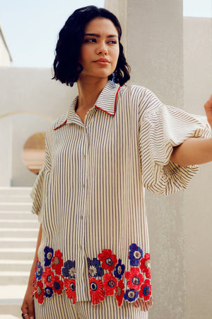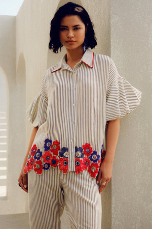 The Elise shirt is made of pure crepe with a regular collar and balloon sleeves. It features a striped pattern with delicate floral embroidery and sequins detailing at the hemline.