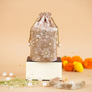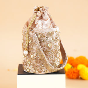 This Elixir Floral Golden Circular Bag is crafted with great precision and hard work. The name "ELIXIR" itself explains the beauty of this bag. The circular shape with this perfect golden monotone combination is absolutely mesmerizing and soothing to the eyes. It comes with a hand embroidered detachable handle.