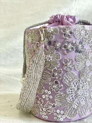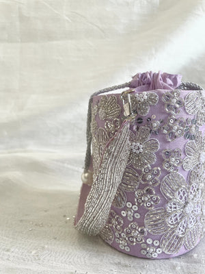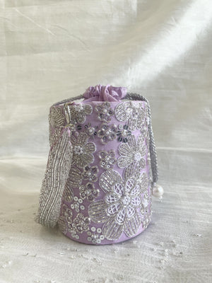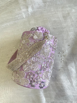 This Elixir Floral Lavender Circular Bag is crafted with great precision and hard work. The name itself explains the beauty of this bag. The circular shape with this perfect lavender and silver combination is absolutely mesmerizing and soothing to the eyes.