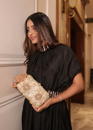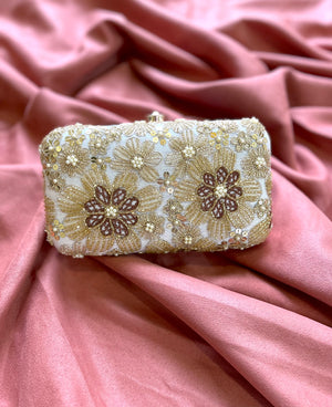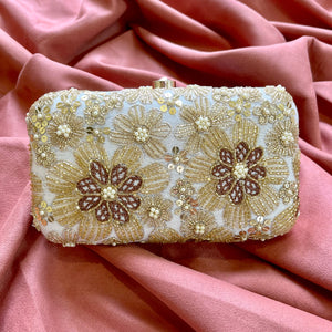 The perfect amalgamation of gold and floral embroidery in artisanal excellence! The metal closure, classic silhouette and the shimmering sequins make our Elixir Golden Clutch an alluring accessory. An instant eye-catcher, own it to know it! Made in Poly dupian, this is available in off white.