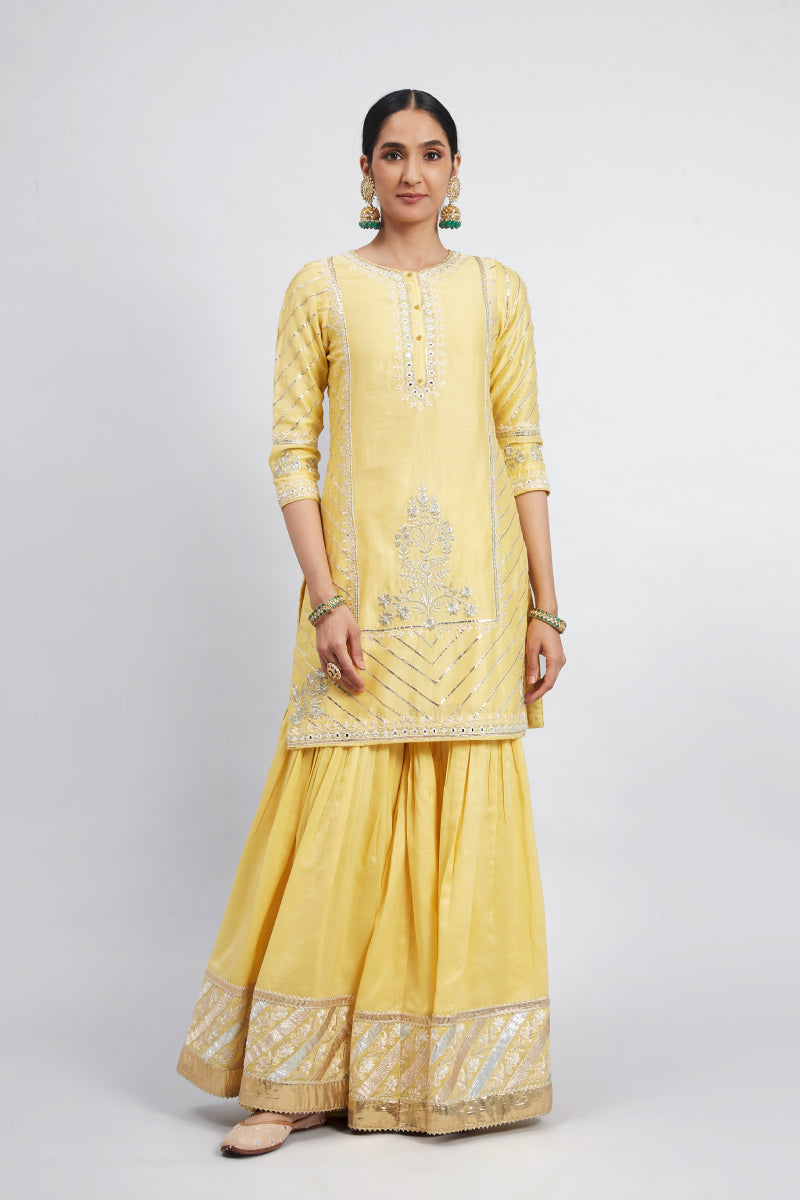 The Eliza ensemble from our Falak Collection is made using a pure Chanderi Silk fabric. It features a Crew neck with a placket and three-quarter sleeves. The outfit is finished using a tone on tone Chanderi Silk Banarsi fabric. The placket with is finished with ghunghroos for a more traditional touch.