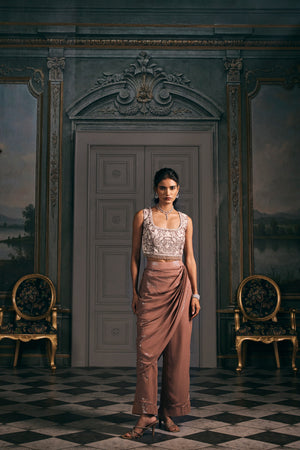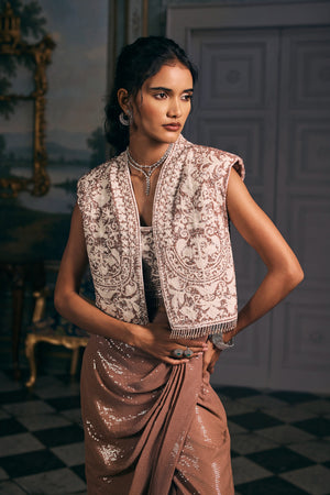 Step into modern sophistication with this thread work jacket and inner set, crafted with exquisite embroidery that showcases artisanal finesse. The jacket, with its intricate detailing, exudes timeless elegance while the delicately embroidered inner adds depth and richness to the look. Together, they create a regal statement that balances structure with fluidity. Complementing the upper silhouette are draped sequinned pants, designed to bring shimmer, movement, and a touch of contemporary glamour. The sequins catch the light effortlessly, making this ensemble perfect for occasions that demand both grandeur and individuality. The fusion of a classic embroidered jacket with the modernity of draped pants makes this outfit a standout choice for cocktail soirées, festive evenings, and wedding celebrations. Created for the modern woman who values luxury, artistry, and versatility, this ensemble is a celebration of design that redefines indo-western couture.
