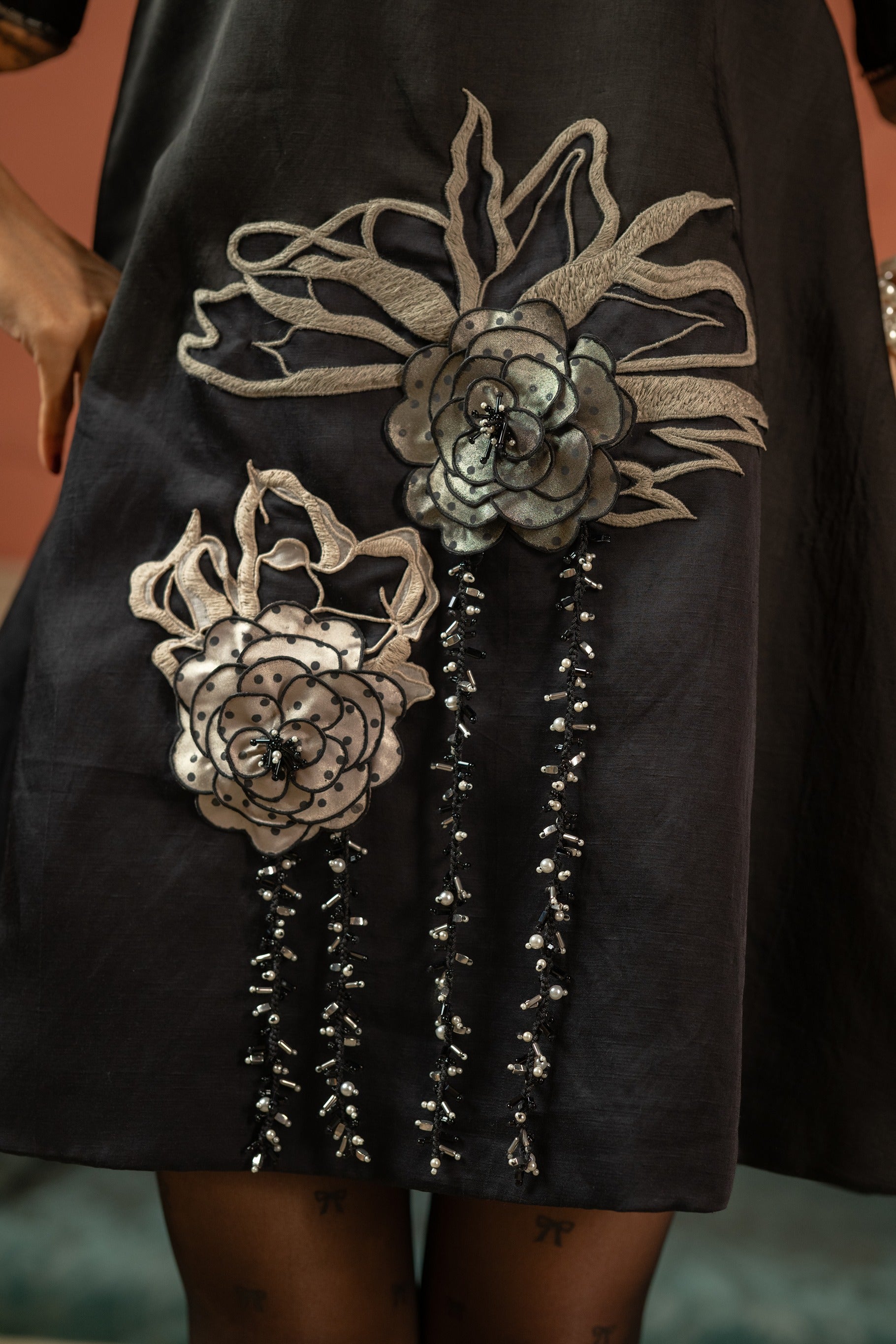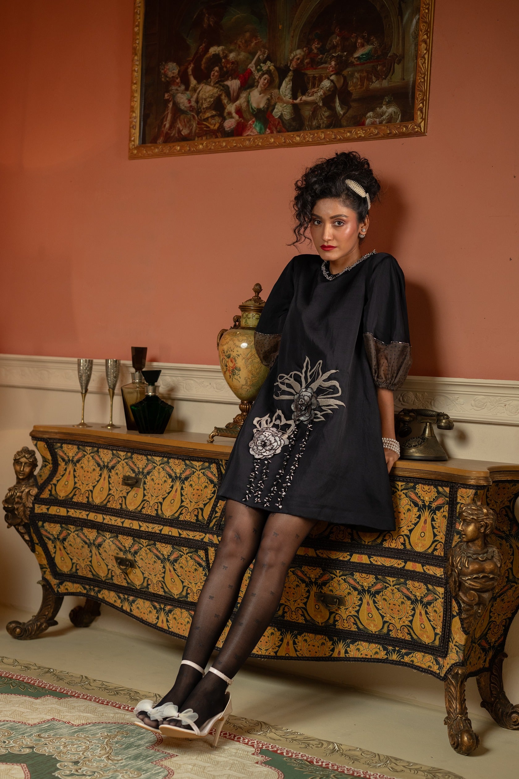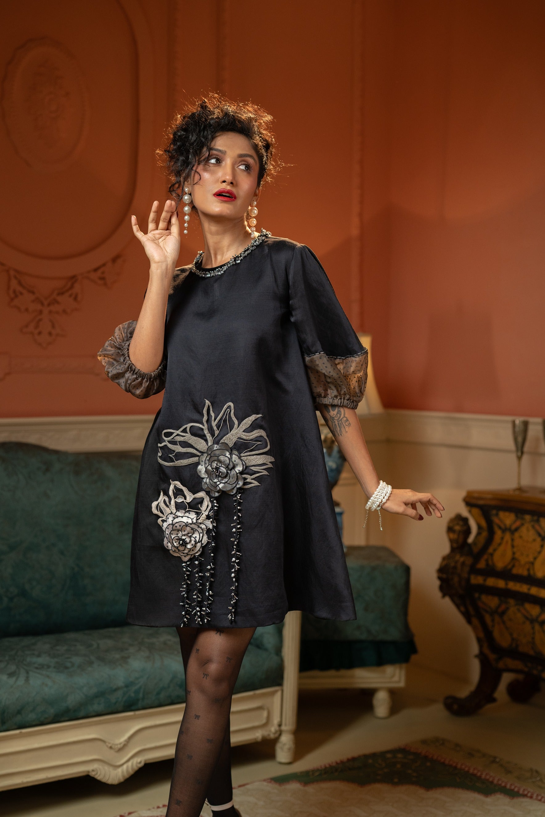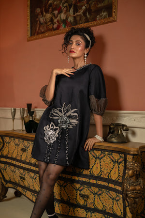 Black satin reimagined in an A-line silhouette that moves with ease. Organza cuff sleeves bring soft drama, while 3D florals and fine beadwork bloom along the hem. A touch of embellishment at the neckline completes this modern vintage statement