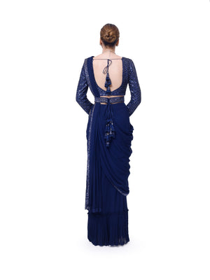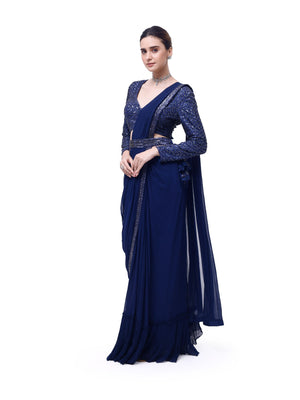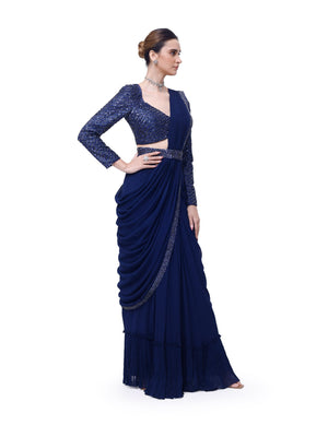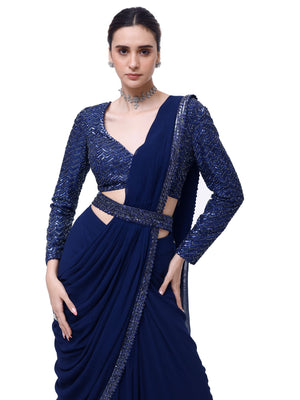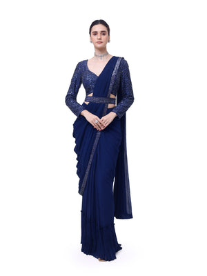 Royal blue pre-stitched georgette saree with narrow embellished edges. Comes with an all-over embellished full sleeve blouse and a belt. Embellishments include cutdana and sequin work.
