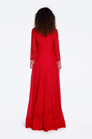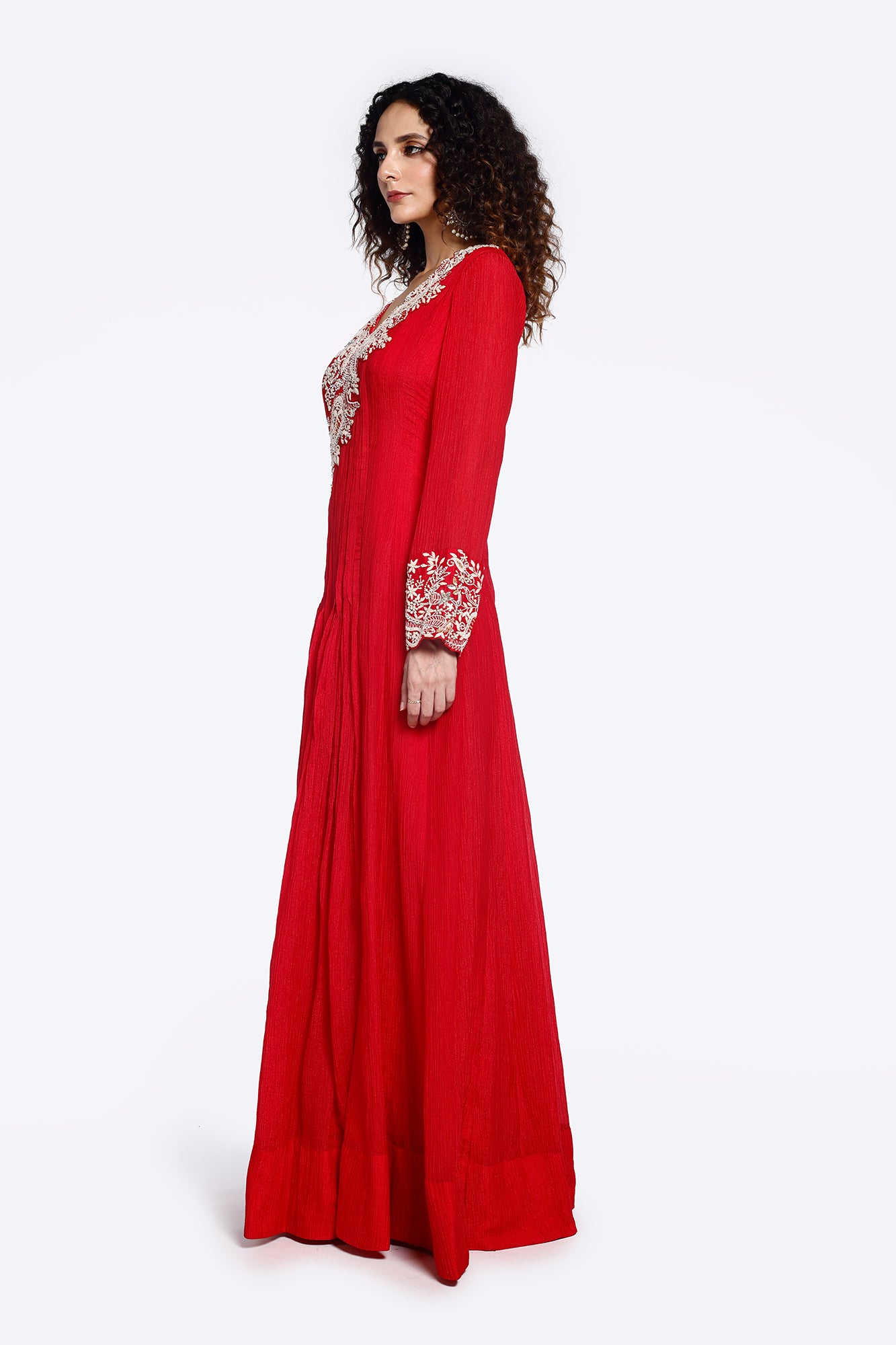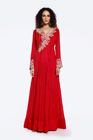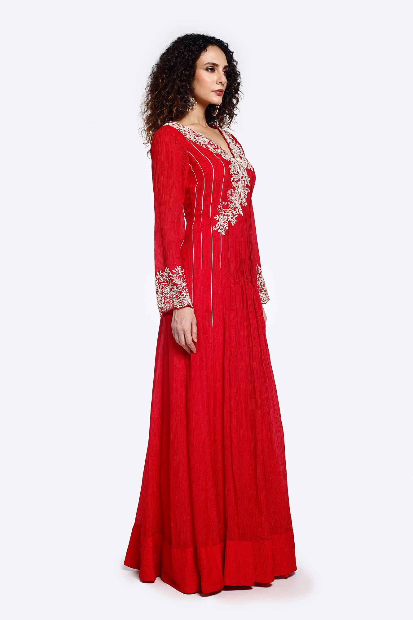 Crush fabric Anarkali suit set featuring a long line Anarkali suit with Embroidered decolletage and handcuffs. paired with a band and plain dupatta. Embellishments include multicolour thread work, cheed and sequins