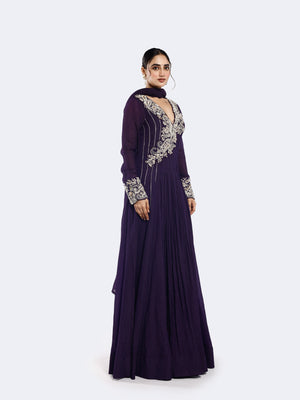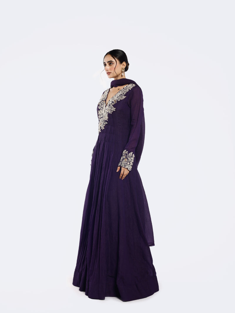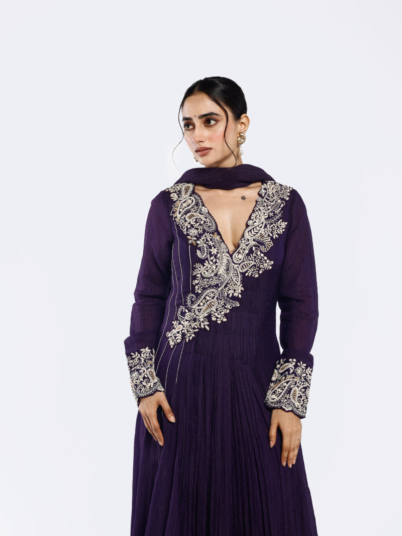 Crush fabric Anarkali suit set featuring a long line Anarkali suit with Embroidered decolletage and handcuffs. paired with a band and plain dupatta. Embellishments include multicolour thread work, cheed and sequins