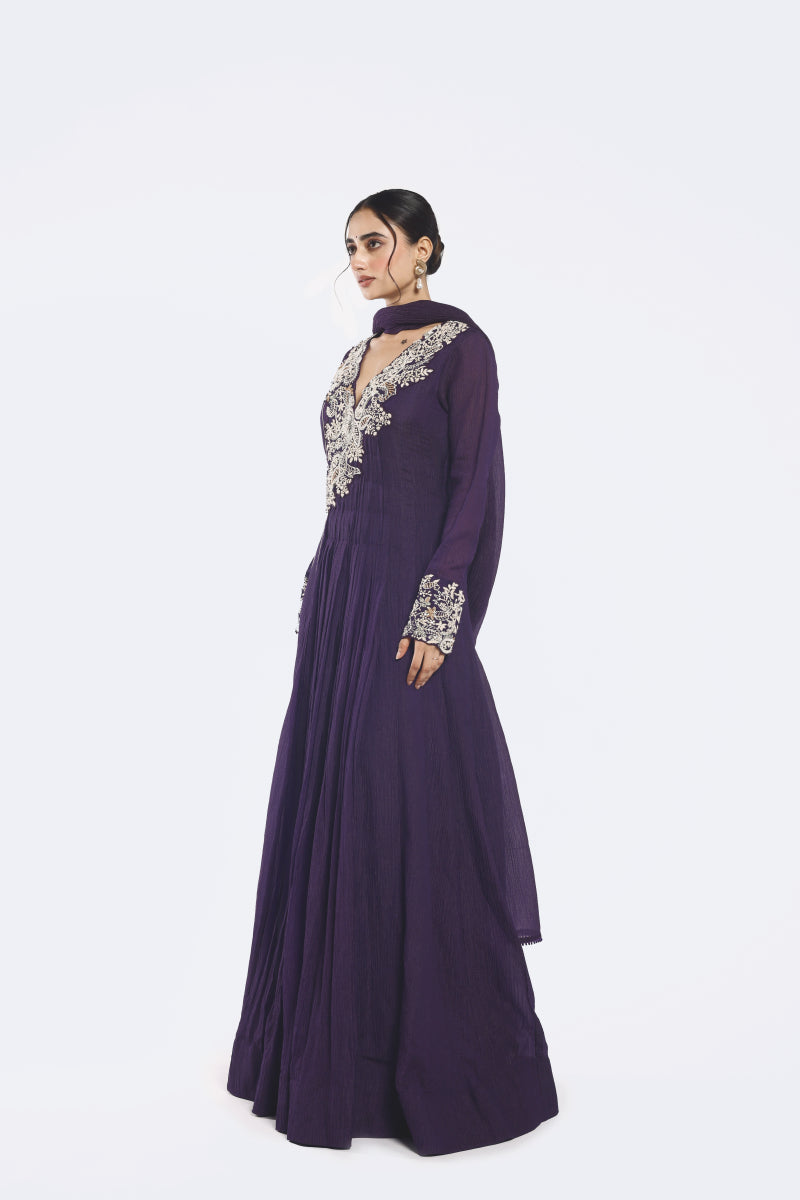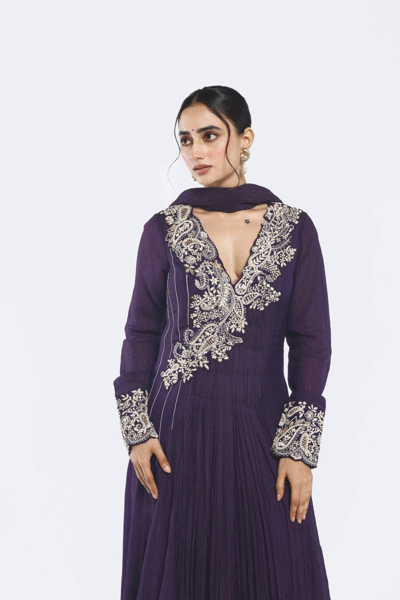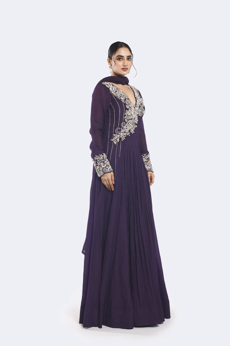 Crush fabric Anarkali suit set featuring a long line Anarkali suit with Embroidered decolletage and handcuffs. paired with a band and plain dupatta. Embellishments include multicolour thread work, cheed and sequins