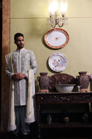 Sherwani: Sage silk embroidered sherwani with full sleeves. It is knee length.| Kurta: Sage silk knee length kurta with full length sleeves. Salwar: Sage modal satin salwar. | Stole: Sage and ivory tie and dye silk stole with embroidered border all over.