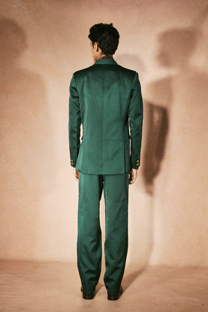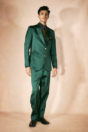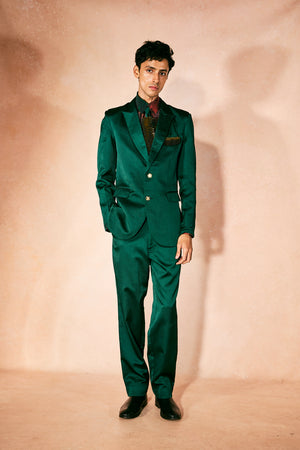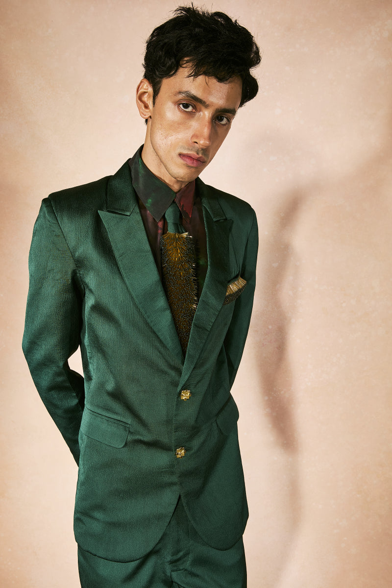 A striking three-piece in enchanted green, featuring a satin blazer and tailored straight-leg trousers. Beneath, a digitally dyed flame-print shirt pairs with a heavily embellished tie. Tailored, tonal, and designed to stand out, luxury menswear with bold, transformative energy for festive evenings and high-profile celebrations.