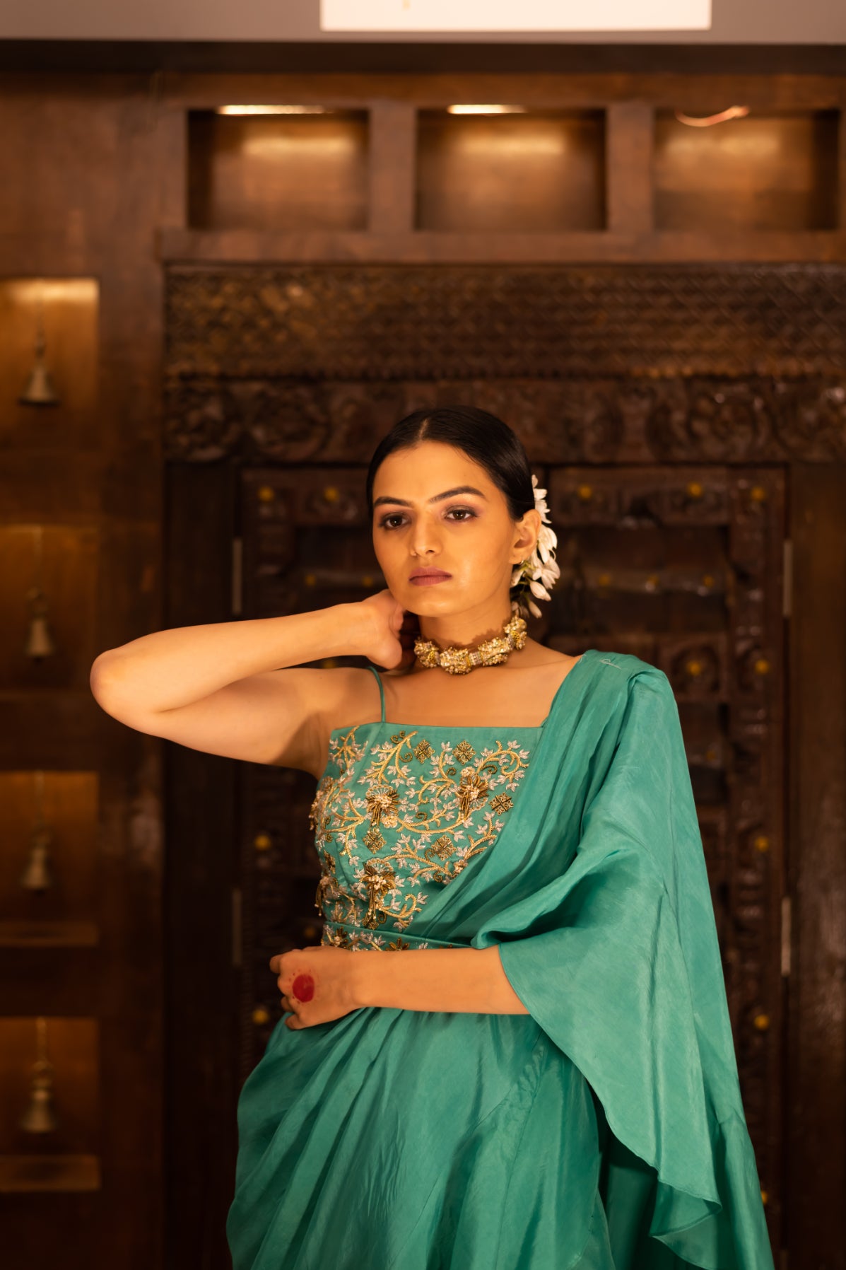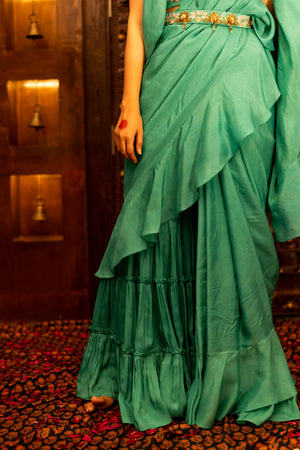 Featuring an emerald green Shararas draped saree in viscose and crepe base with cutdana hand embroidery. It is paired with a matching blouse and a satin waist belt.