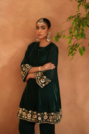 Deepika Chadha's stunning Emerald green velvet tunic beautifully adorned with intricate Zari, sequins, cutdana and stones embroidery with bell steeves. It is paired with green velvet pants with embroidery on bottom which makes you feel stylish all day long and is perfect for wedding and festive season.