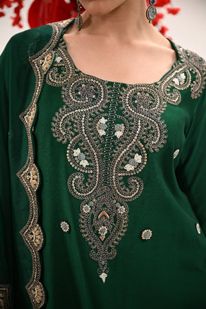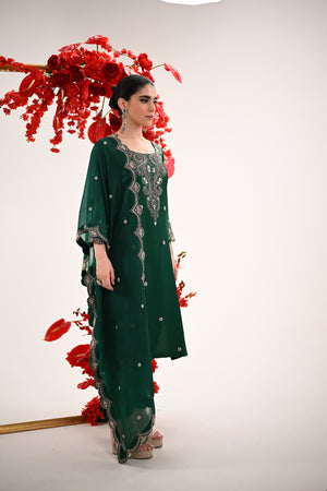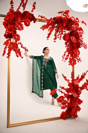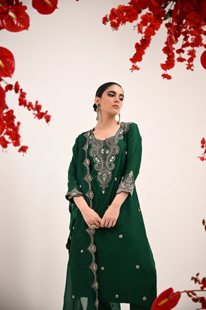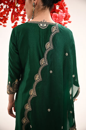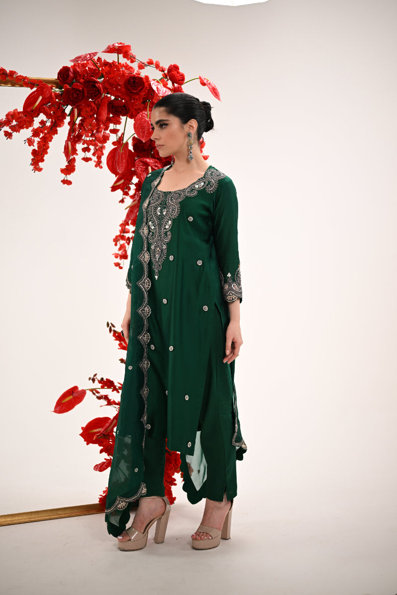 A deep emerald green kurta set featuring ornate hand embroidery, scalloped detailing, and a structured yet fluid silhouette. Paired with tapered pants and a matching dupatta, it’s an elegant ode to timeless festive dressing — understated yet unforgettable.