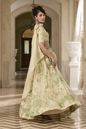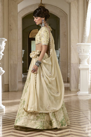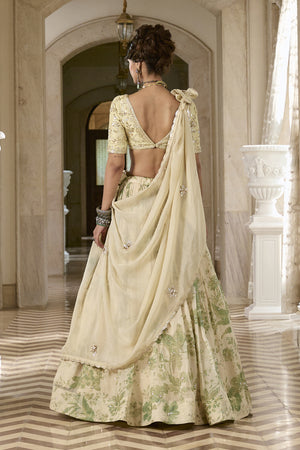 An ivory printed lehenga adorned with intricate hand embroidery and finished with playful tassel detailing. It is paired with a complementary ivory blouse, also featuring delicate hand embroidery, and completed with a sheer, embroidered, organza dupatta edged with elegant scalloped detailing.