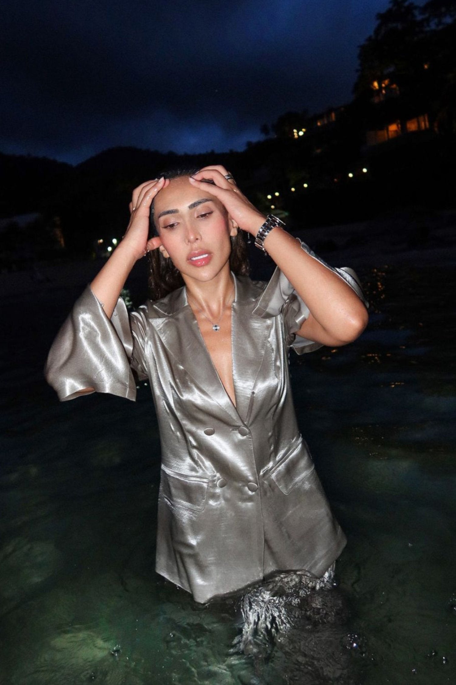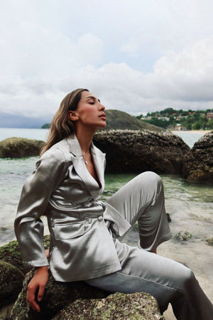 Dive into sophistication with our blazer and pant co-ord set, a perfect harmony of silver and grey tones. This ensemble exudes a timeless charm, featuring a sleek and modern design that adds a touch of elegance to your look