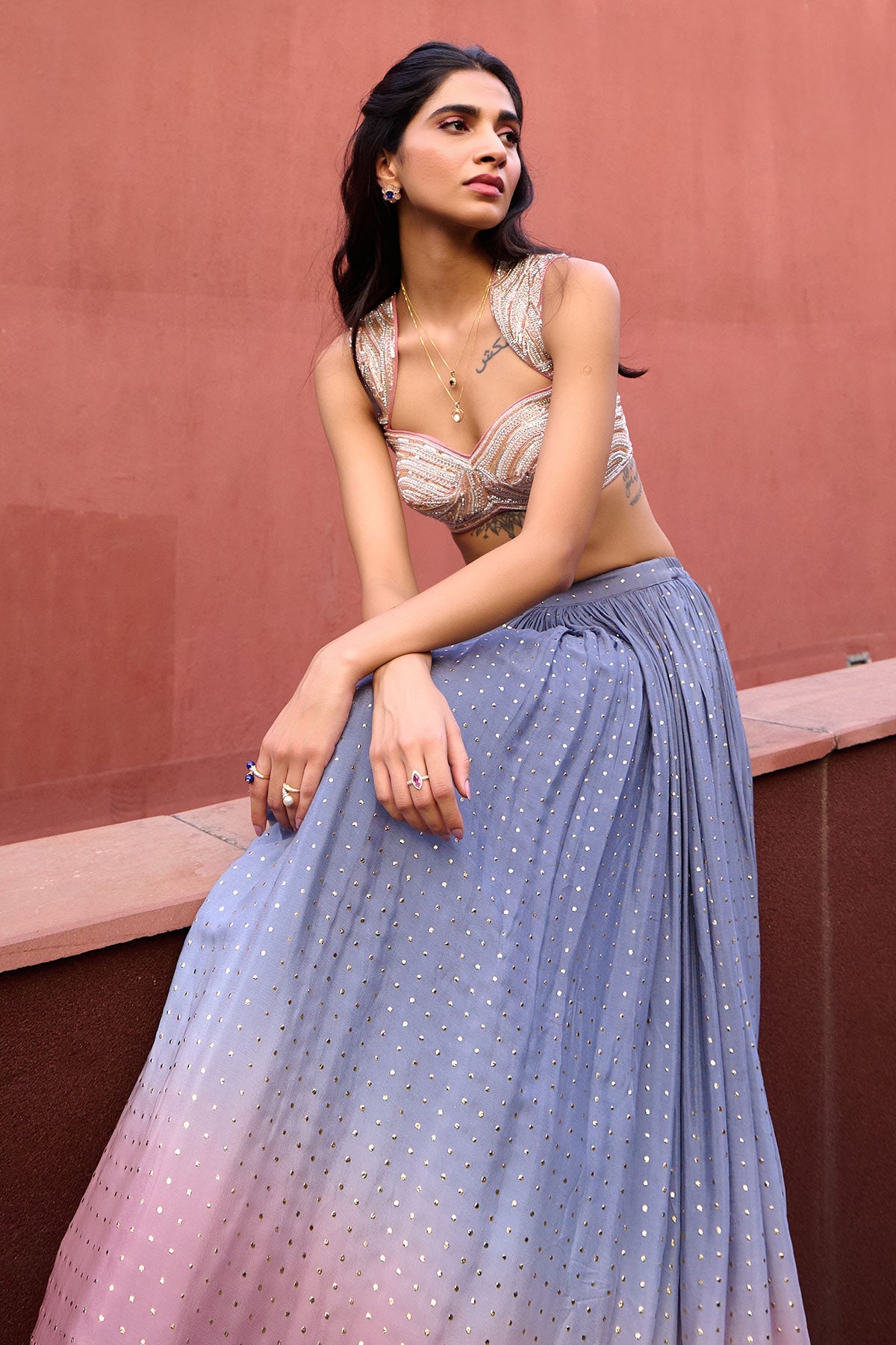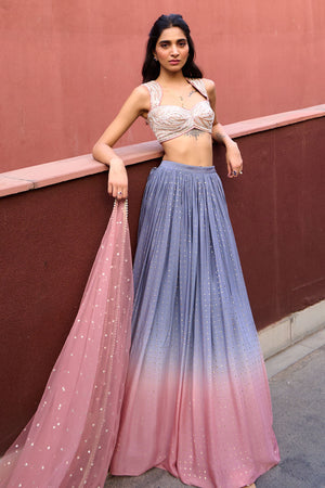 Grey to Mauve Pink Ombre Lehenga paired with mauve pink glass beads glamourous embroidered blouse and tulle dupatta