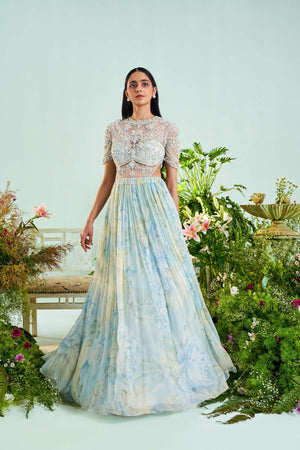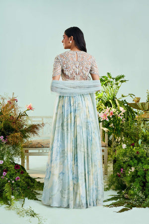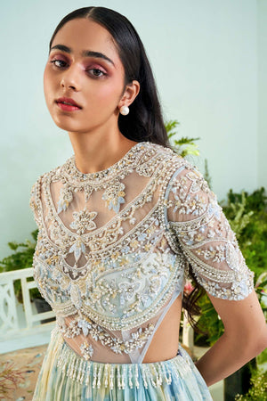 This set includes ice blue embroidered yoke anarkali with tassel dupatta.