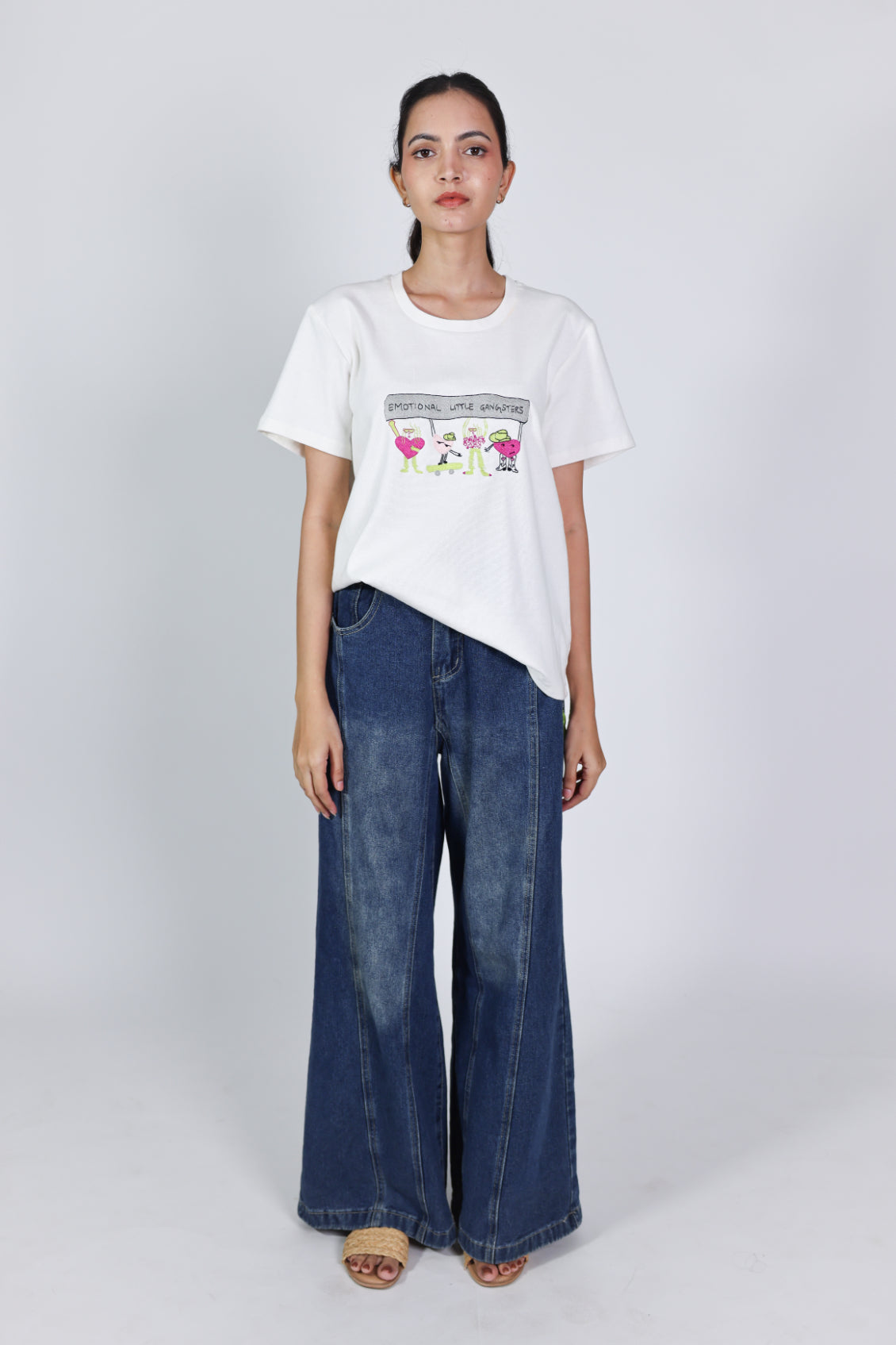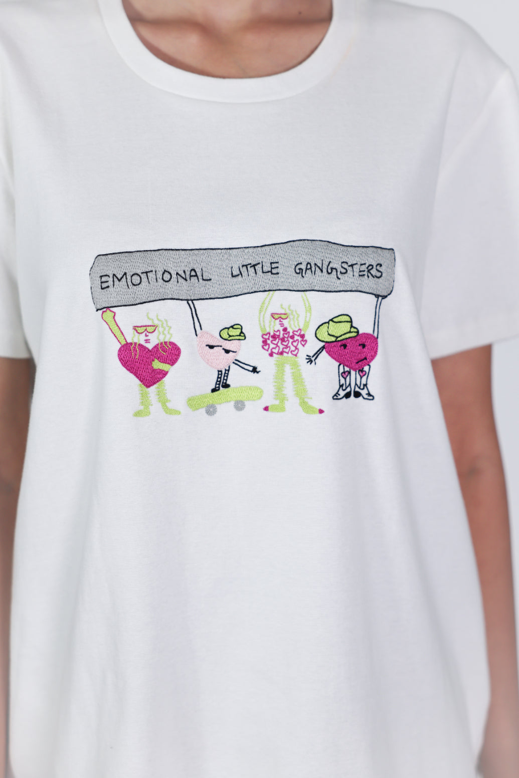 A Comfy Feminine Tee With The ‘Emotional Little Gangsters’ Club Hand/Embroidered Across The Chest.