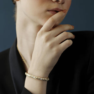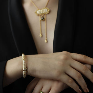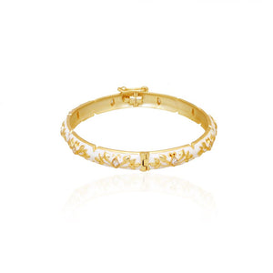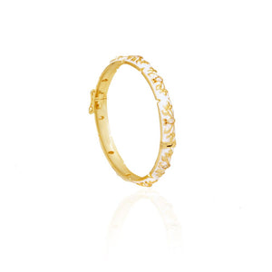 An openable bangle inspired from the vintage baroque style. An intricate piece in a unique design and a classic combination of white and gold. The embossed detailing finished with hand painted enamel encrusted with crystals will add glam to any look.Weather you're styling a black top or white blouse, this piece will surely make you look and feel stylish. If you're feeling experimental, wear it with a pant suit with a matching necklace for a formal look or wear them with a traditional outfit such as a sari or crop top and skirt on a destination wedding.