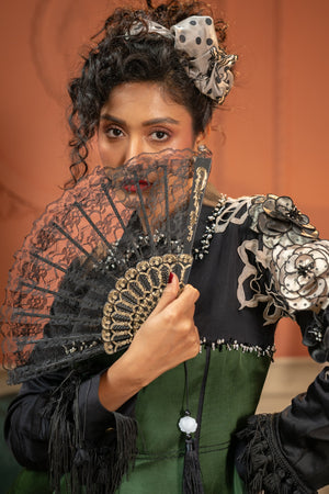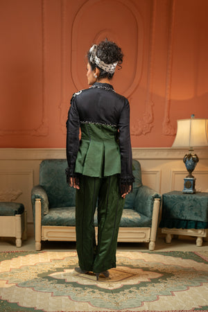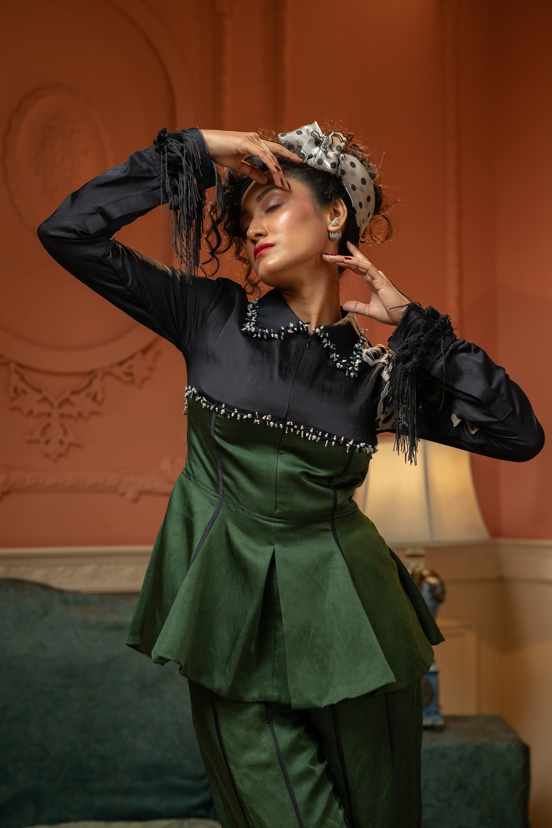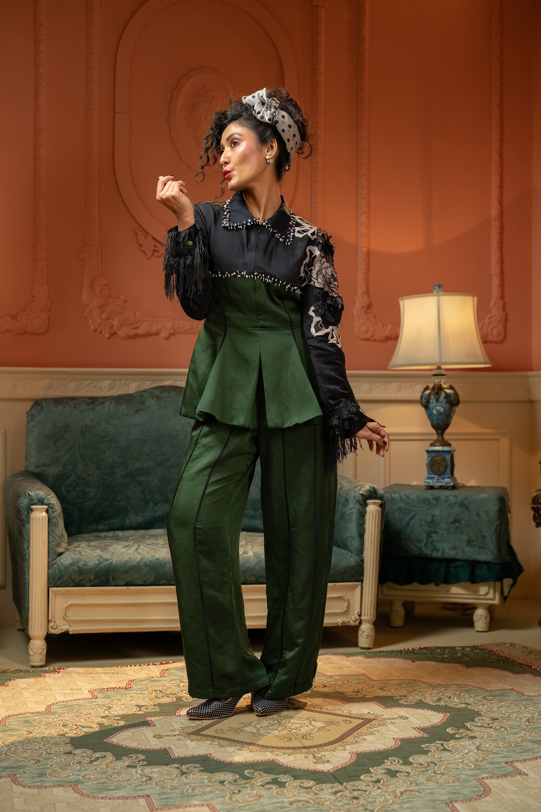 A green and black peplum co-ord set crafted in a structured, textured fabric. The top features