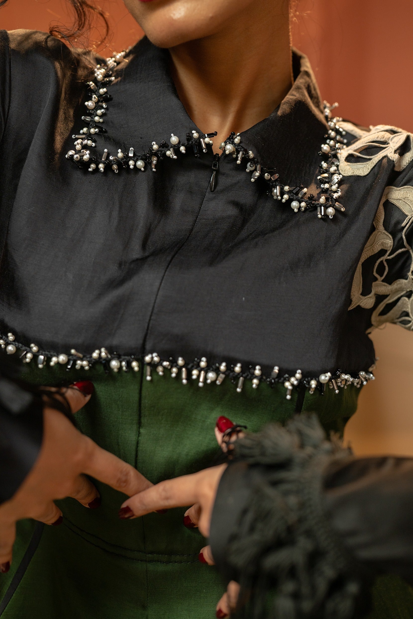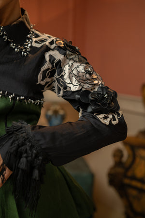 soft peplum volume with hand-embellished accents and 3D floral detailing on the sleeves.