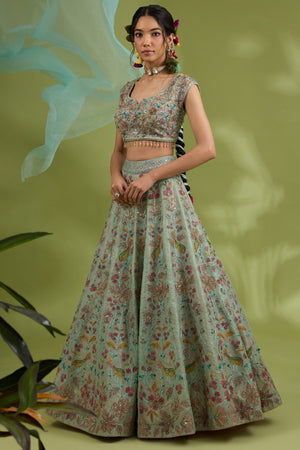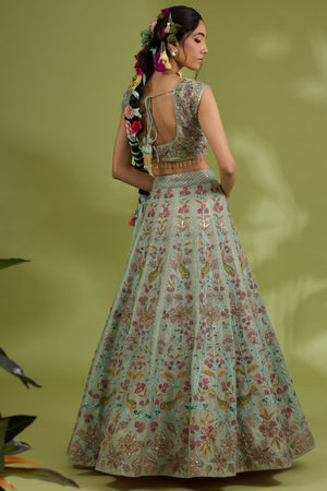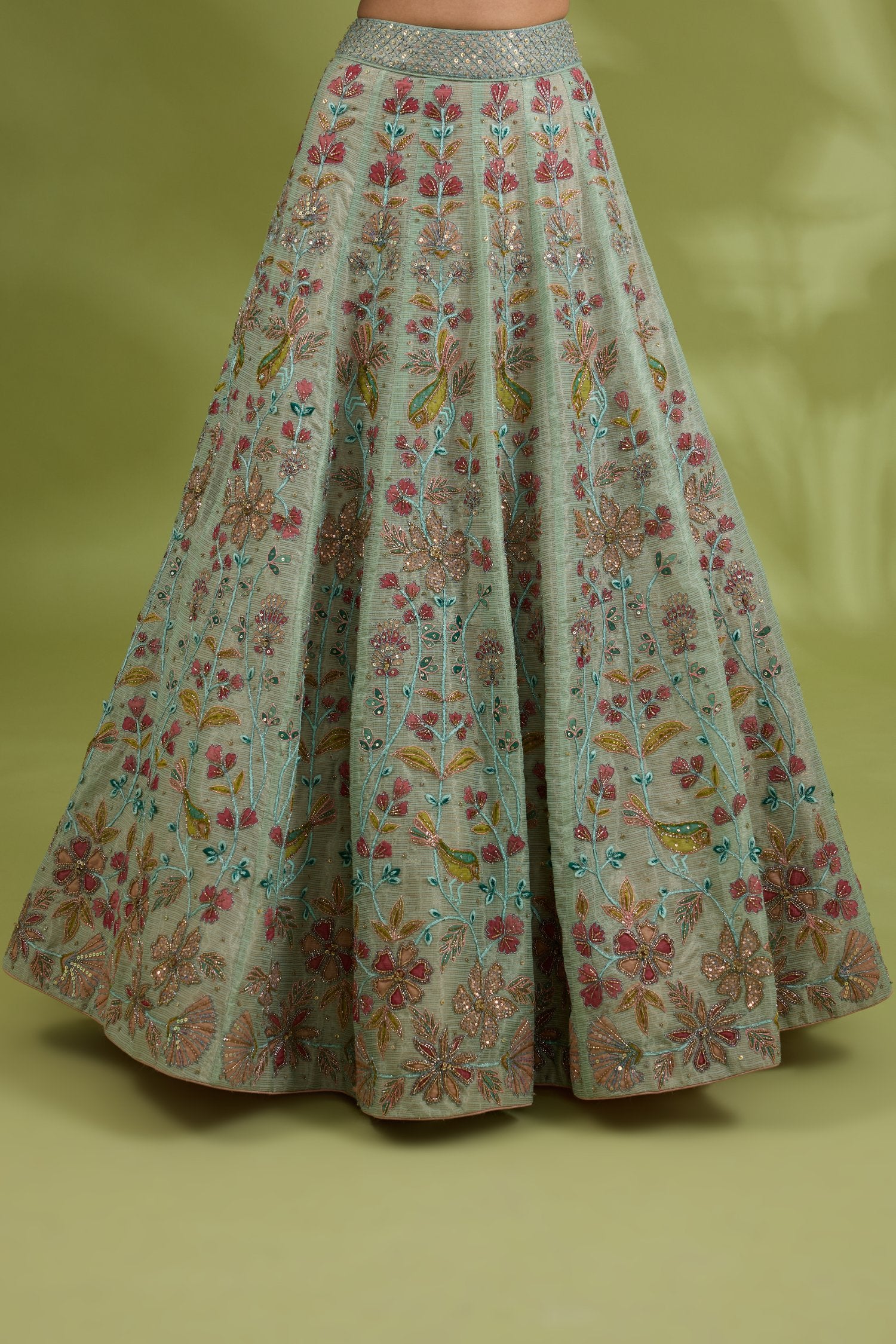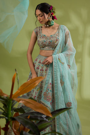 A luxurious lehenga adorned with intricate hand embroidery, radiating elegance and sophistication. The ensemble includes a stunning blouse that enhances the overall appeal. Paired with a dupatta featuring a statement border, the detailed embroidery on both the lehenga and blouse creates a rich, opulent look, making it ideal for any grand occasion.