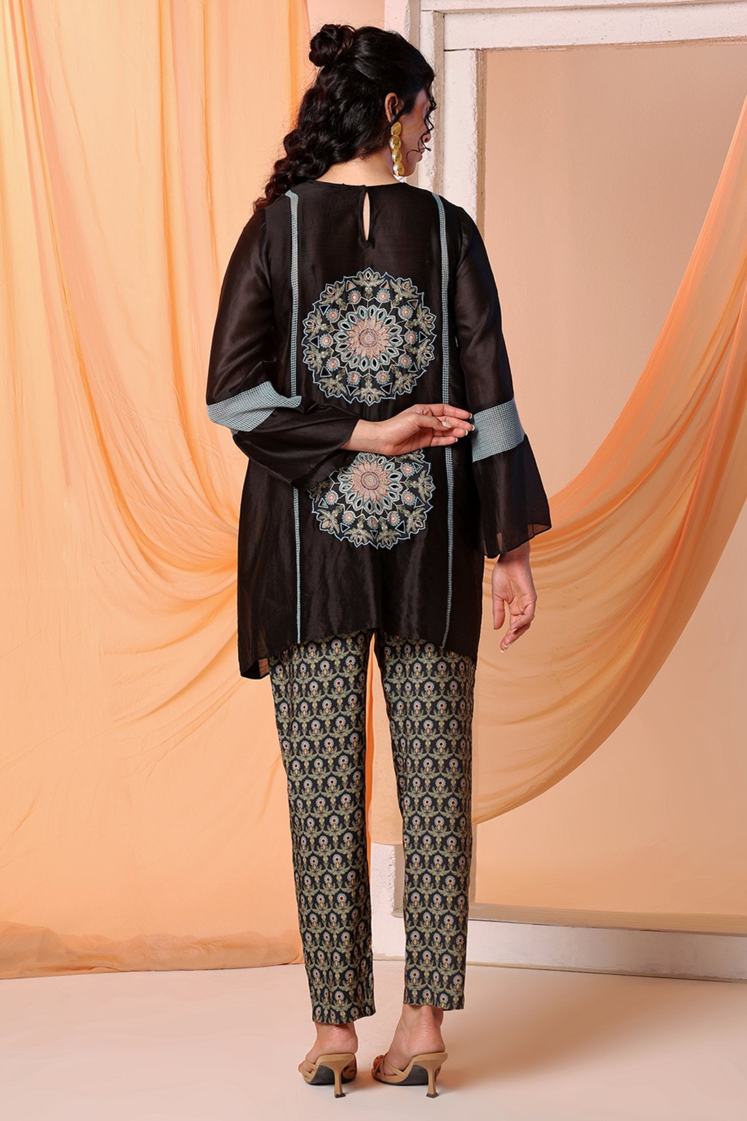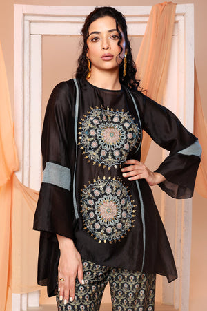 Black Eraya Appliqué Asymmetrical Top in Handloom Cotton paired with Printed Green Muslin Pants