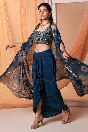 Blue Eraya Embroidered Choli and Drape Skirt Paired with Organza Asymmetric Cape