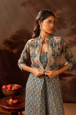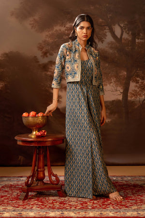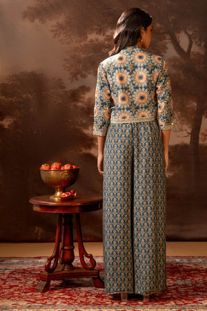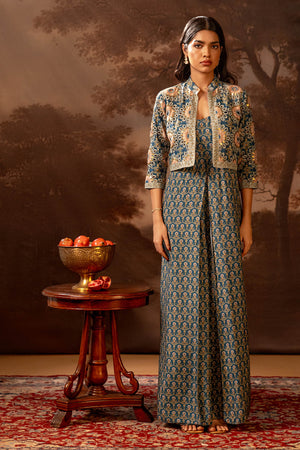 Black eraya embellished linen silk crop jacket paired with a green printed jumpsuit.