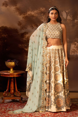 Beige Eraya Embroidered halter-neck choli with silk lehenga, paired with a cutwork border dupatta in organza.