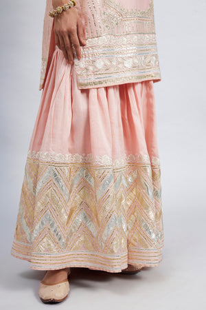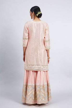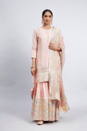 This Erina ensemble from our Falak Collection is made using a pure Chanderi Silk fabric. It features a Crew neck with placket and three-quarter sleeves. The outfit is finished using a tone on tone Chanderi Silk Banarsi fabric. The placket with is finished with ghunghroos for a more traditional touch.