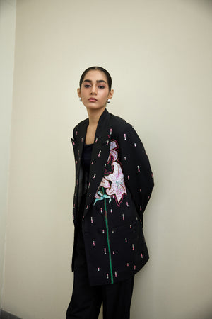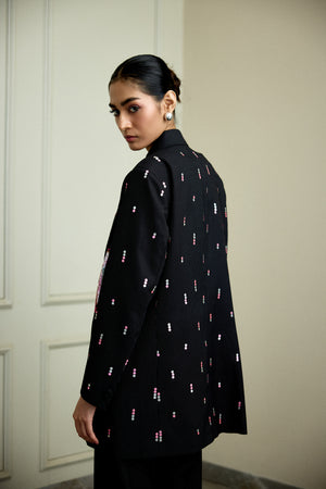 Enhance your wardrobe with the Eris Blazer Set, showcasing a black embroidered jacket decorated with delicate pink floral designs. Crafted from Italian suiting fabric, this refined piece merges classic elegance with a subtle touch of color, making it ideal for a sophisticated and polished appearance. The detailed embroidery brings texture and dimension, while the tailored fit flatters your silhouette with a sleek finish. Perfect for occasions that require a graceful yet unique style.