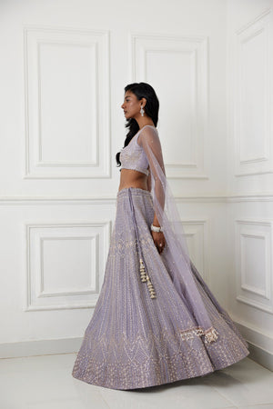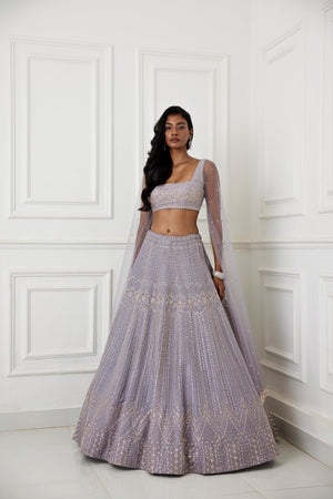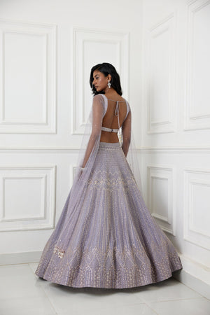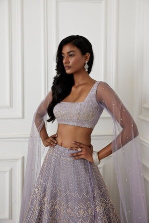 Lavender Organza Lehenga With Glass Beads, Zardozi And Pearl Embellishments Paired With Raw Silk Embroidered Blouse With Long Tulle Cape Sleeve.
