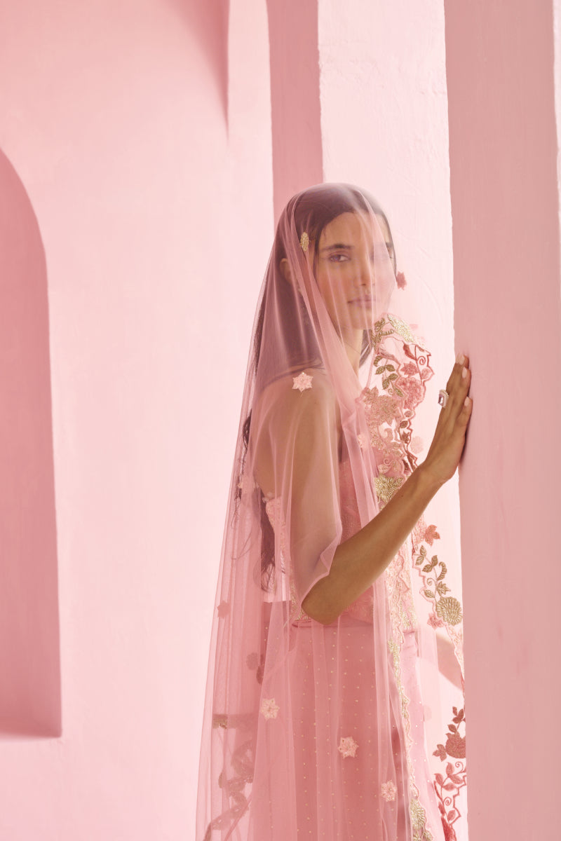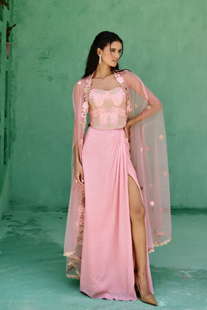 Embellished drape skirt paired with thread, glass beads and zardozi embroidered corset top and tulle cape.