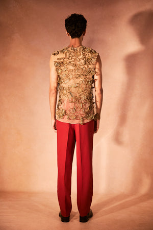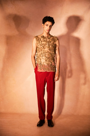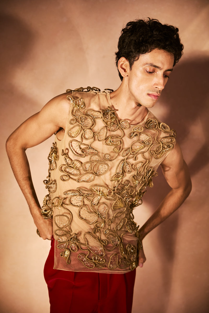 A sheer molten gold tunic with 3D abstract cording and hand-embroidered embellishments, paired with tailored flame-orange trousers. Where craft meets structure, made for modern celebrations, statement occasions, and elevated evenings