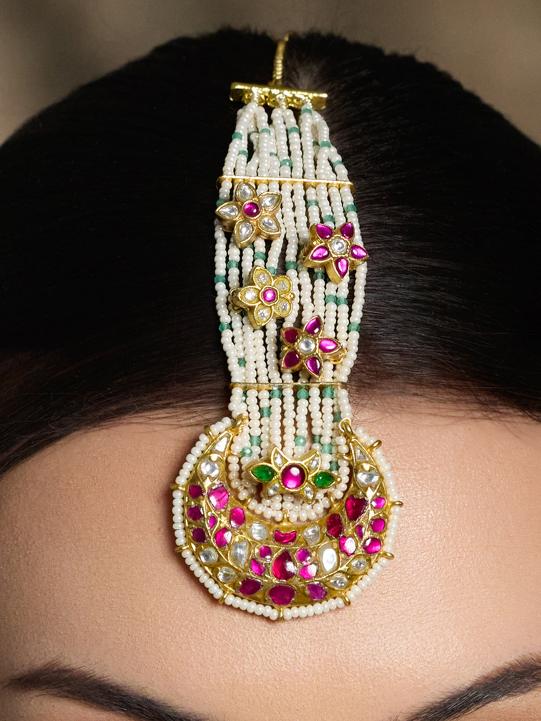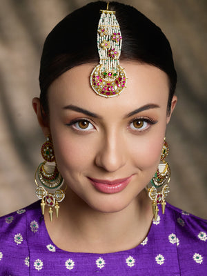 Adorn your look with the Ethereal Blossom Pearl Maang Tikka, featuring delicate pearl strands, floral pink-green accents, and intricate goldwork. An elegant pick for brides, festive occasions, or graceful traditional ensembles.