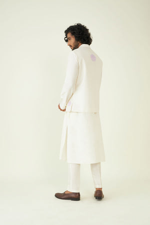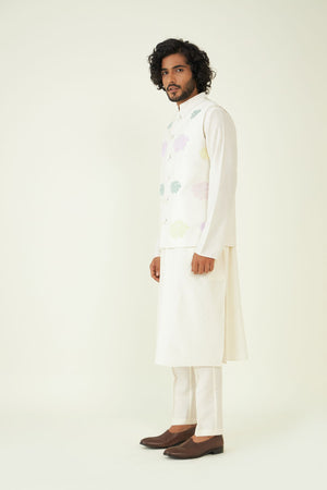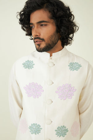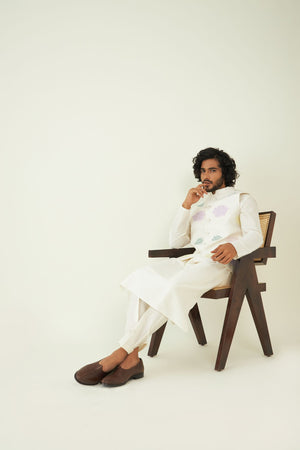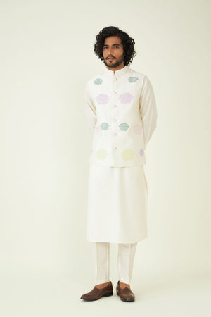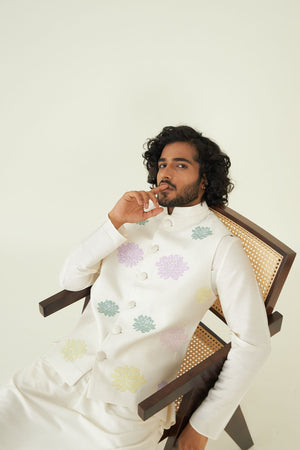 Ivory Resham & Patch Embroidered Menswear Bundi. Falsafa Bundi is tailored for both comfort and style, allowing you to move with ease while maintaining a sleek and elegant silhouette. You can always pair the Bundi with the coordinating kurta set, this set offers convenience and ensures that every element of your outfit is perfectly coordinated.