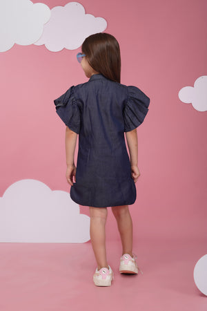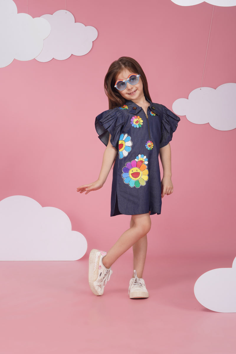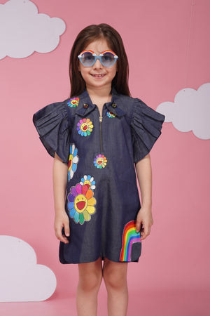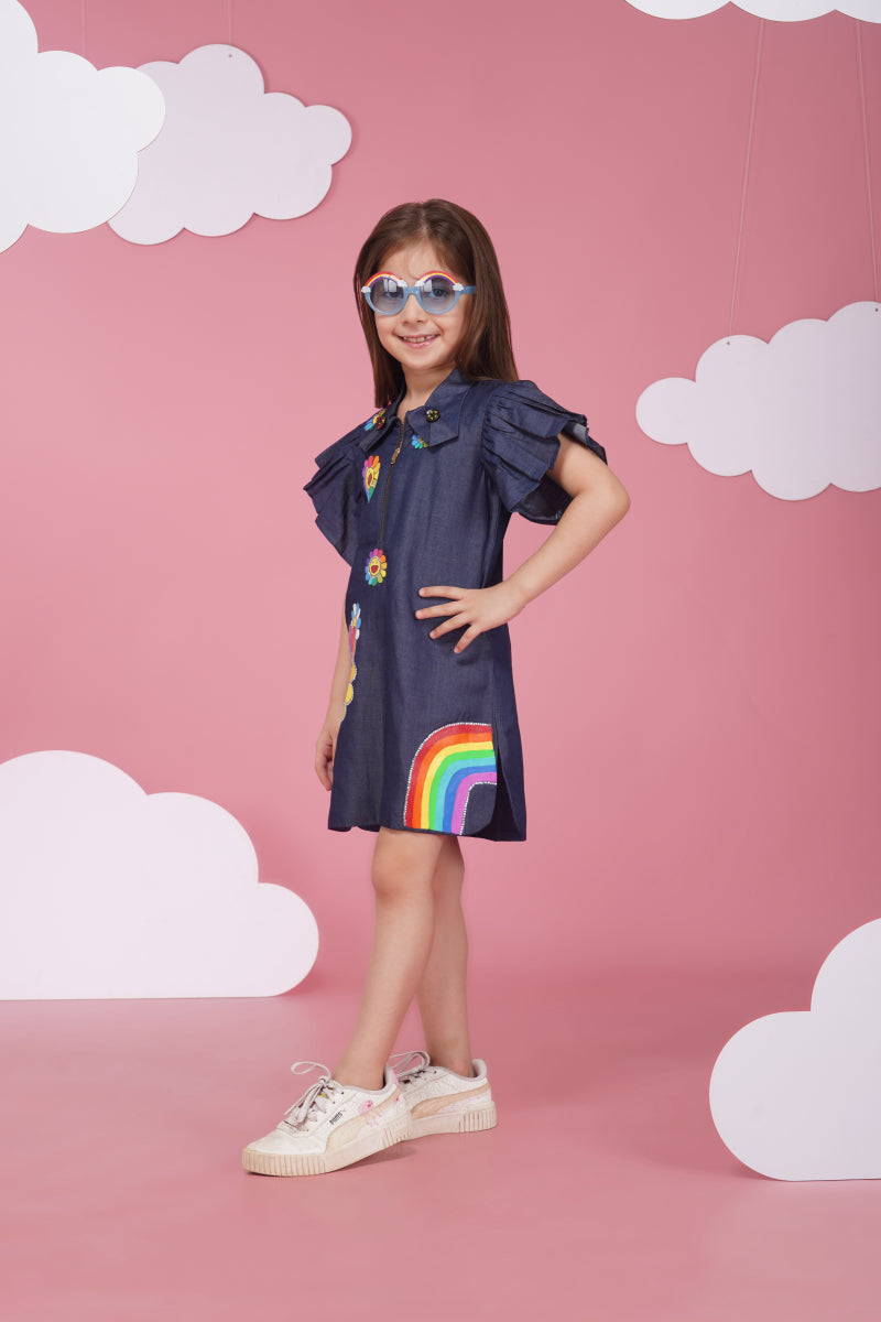 A blue denim dress with flare sleeves and hand painted rain bow smiles in the front