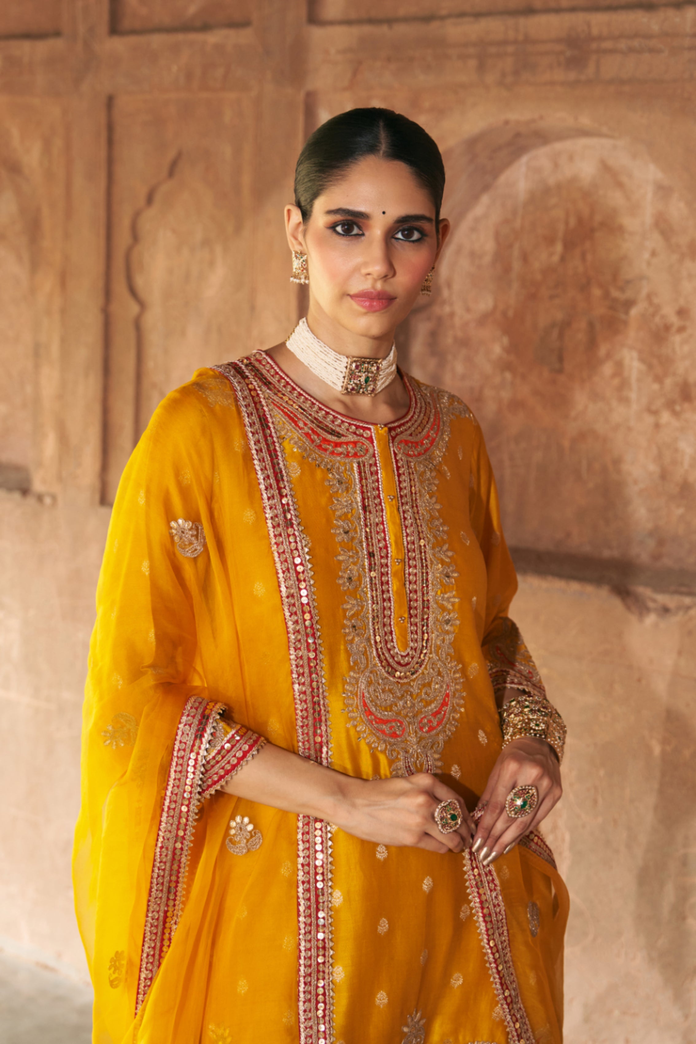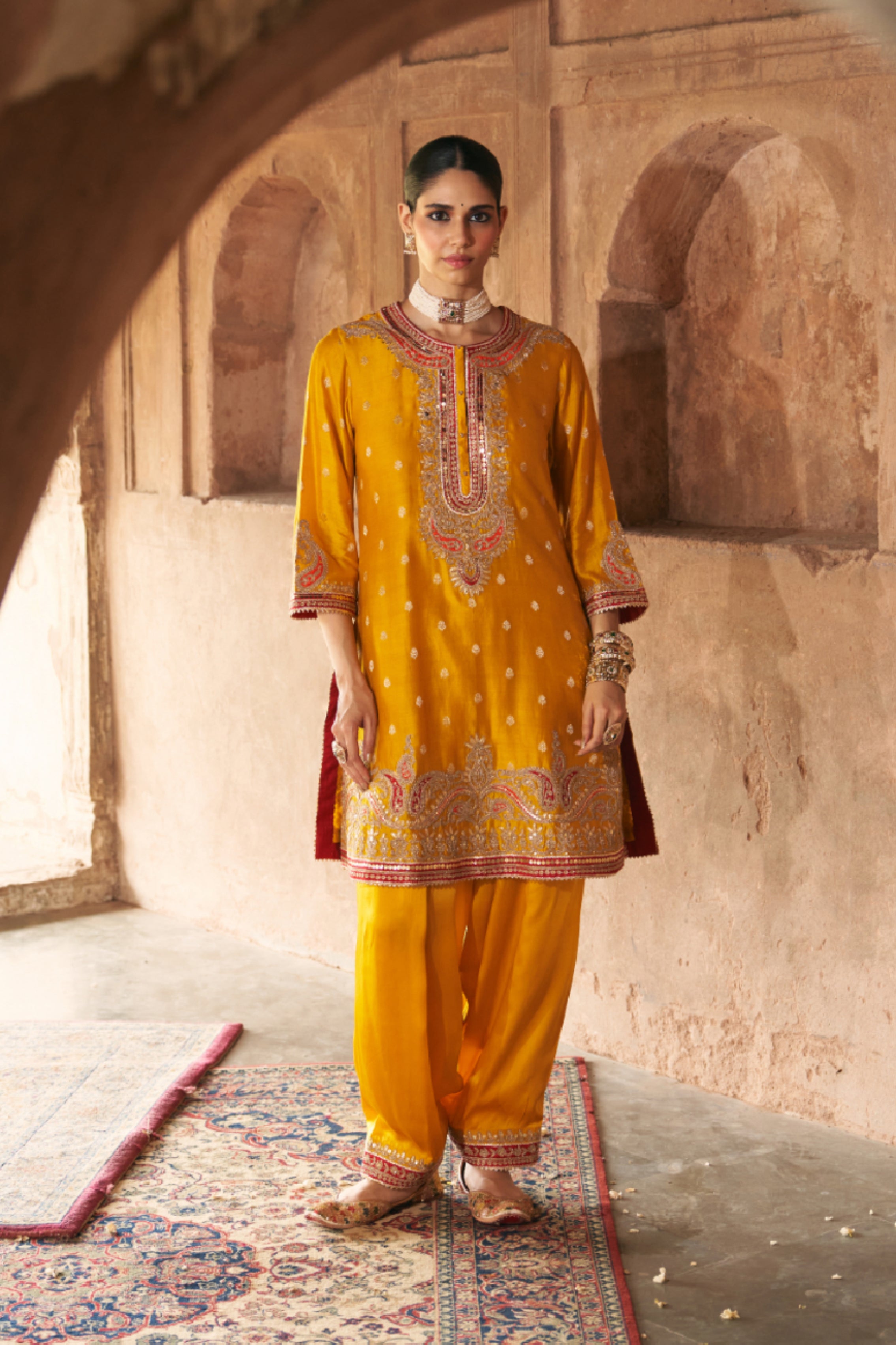This elegant short A-line kurta crafted in pure Silk Banarasi, paired with a traditional Dogri salwar and a silk organza dupatta. The kurta features a zero neckline with placket and elegant bell sleeves. The ensemble is adorned with intricate Kashmiri Tilla and Gota Patti embroidery, highlighted with pearls and sequins, and finished with delicate gota detailing.