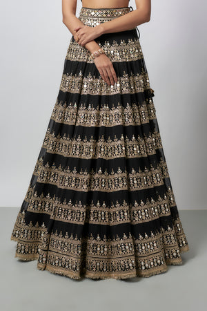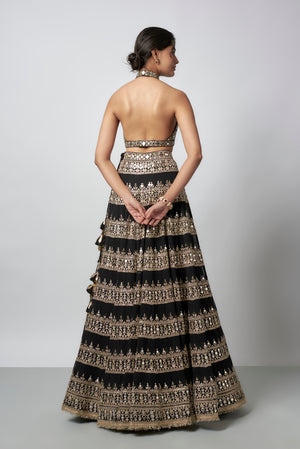 This halter-neck blouse features a keyhole neckline and intricate mirror work with embroidery. Paired with it is a high-waisted kali lehenga with mirror work and traditional motifs.Completed with an organza dupatta with embroidered borders, offering a graceful finish.