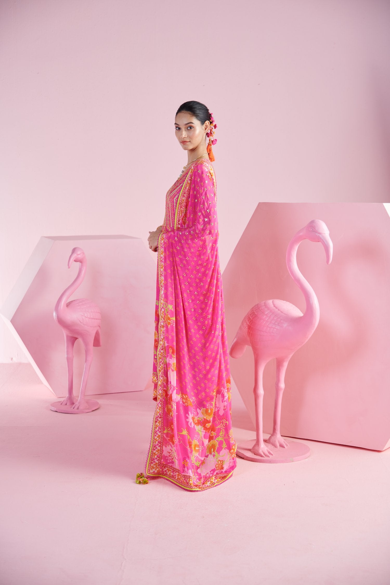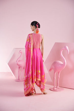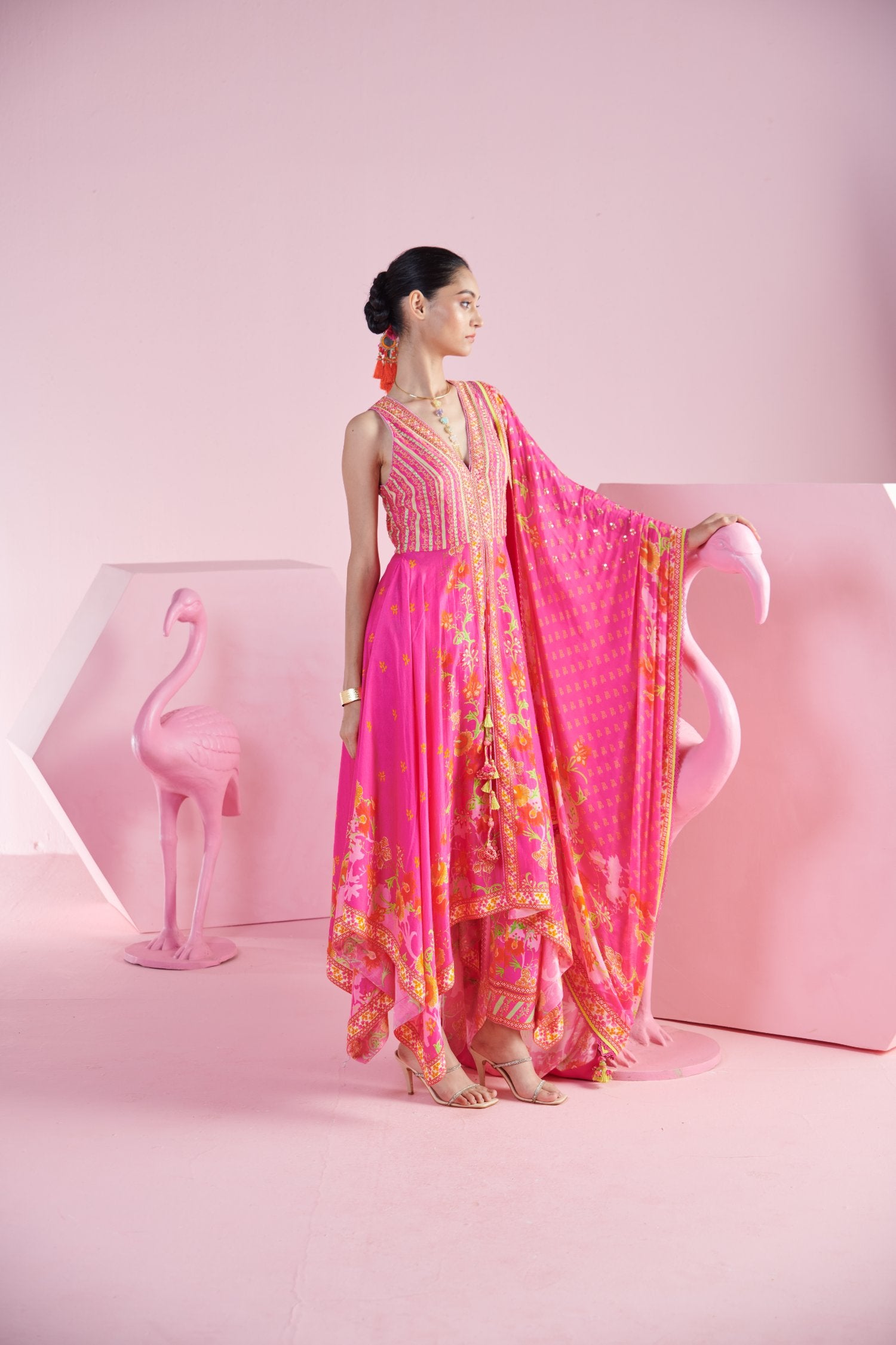 Step into a world of vibrant elegance with the Pink Blossom Cluster Asymmetrical Kurta Set. This exquisite ensemble features an asymmetrical kurta in a stunning pink blossom hue, designed to offer a modern silhouette with a touch of traditional charm. The kurta's unique cut is complemented by intricately printed pants that add a dynamic contrast. The top has embroidery detail. Completing the look is a coordinating dupatta, adorned with complementary prints that enhance the overall aesthetic. Perfect for festive occasions or special events, this set blends contemporary style with classic beauty for a sophisticated and eye-catching outfit."