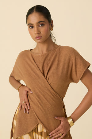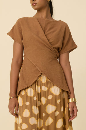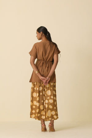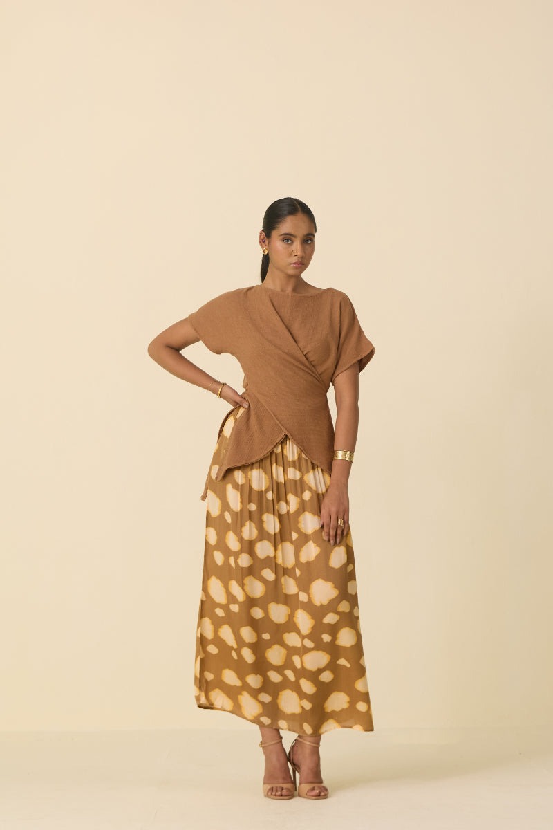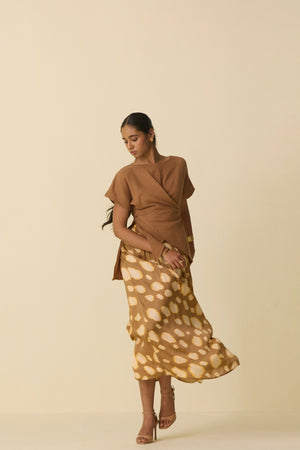 The Fawn Co-ord Set is a radiant blend of elegance and comfort, perfect for warm-weather styling. The wrap-style top, crafted from soft HD cotton with a natural crinkle effect, drapes beautifully with its relaxed drop-shoulder design. Paired with a flowy gathered skirt in luxurious Habutai silk, featuring a mocha mousse hue with a playful white blotch pattern, this set exudes effortless charm. Lightweight and breathable, it’s the perfect pick for vacations, brunches, dates.